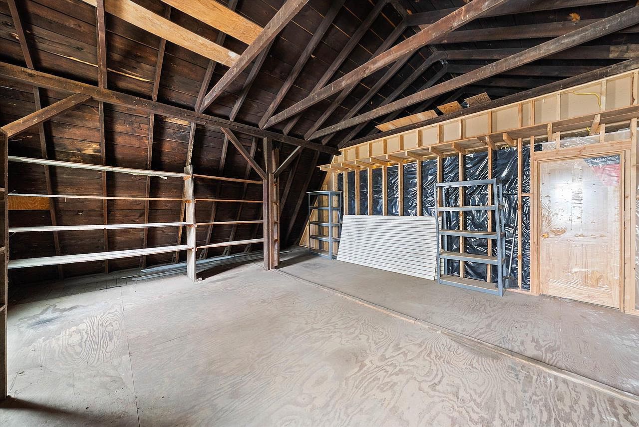 This spacious attic area features exposed dark wooden beams and rafters, showcasing rustic and raw architectural elements. The flooring is plywood, offering a practical foundation poised for future finishing or continued storage use. Along one wall, unfinished wooden studs surround plastic sheeting insulation, hinting at an incomplete renovation. Two metal shelving units provide some storage capacity while horizontal wooden beams add structural support and divide the space. A natural wood door with a simple brass handle leads into the attic, complementing the overall earthy and utilitarian aesthetic, emphasizing functionality with potential for transformation.