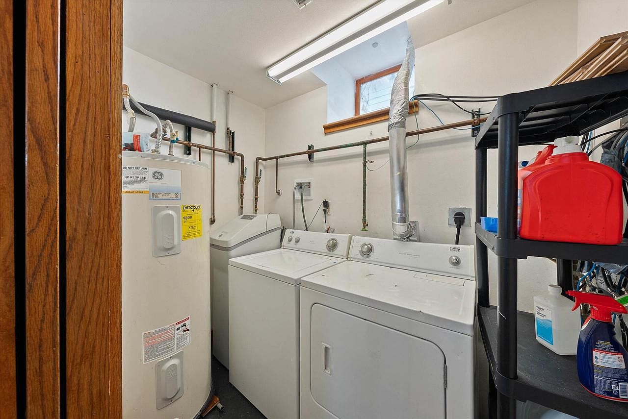 This compact laundry room features practical utility design, combining a white top-loading washing machine and a matching front-loading dryer positioned side-by-side beneath exposed copper piping. A tall water heater stands to the left, with visible labels and safety notices. A small, high window allows natural light to filter in, contrasting with the fluorescent ceiling light that ensures ample brightness. The walls are painted a clean, neutral white, providing a fresh and functional backdrop. On the right, a black plastic shelving unit holds various cleaning supplies and detergent containers, balancing storage with accessibility. The overall aesthetic is utilitarian and straightforward, focusing on convenience and utility.