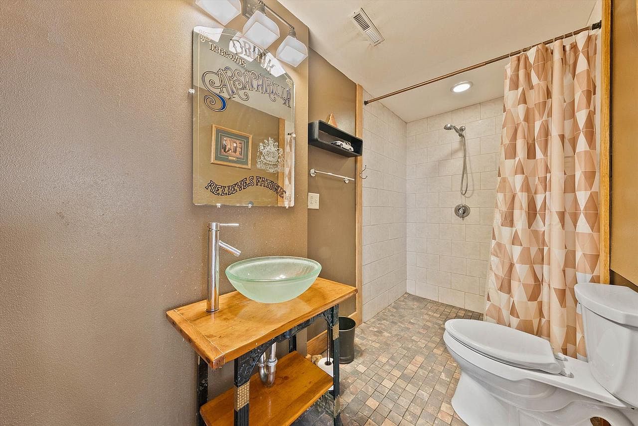 This bathroom highlights a compact yet inviting layout with textured earthy tones. The wall is painted a warm taupe, which complements the natural wood vanity featuring a modern glass vessel sink and sleek, minimalist faucet. Above the vanity, a distinctive mirror with vintage-style typography adds character and charm. The shower space is defined by cream-colored subway tiles and a geometric patterned shower curtain in varying shades of beige and brown. The floor is paved with small, square tiles in earthy tones, creating a cohesive look. A white toilet sits beside the shower, rounding out the functional space.