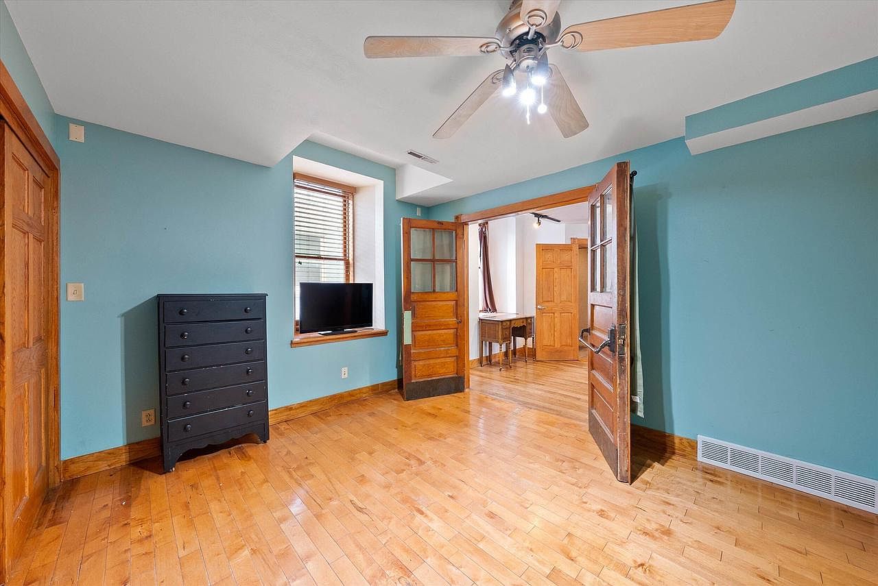 This bedroom features a calming blue color scheme on the walls contrasted with natural wood trim and hardwood flooring. A black chest of drawers sits against one wall, while a modest flat-screen TV is positioned on the window ledge of a recessed bay window, allowing natural light to brighten the room. The ceiling is white with a modern ceiling fan that includes several lights. Double wooden doors with glass panes open into an adjoining room with similar flooring and wood accents, providing a warm and inviting flow between spaces. The overall design balances classic elements with a light, airy atmosphere.