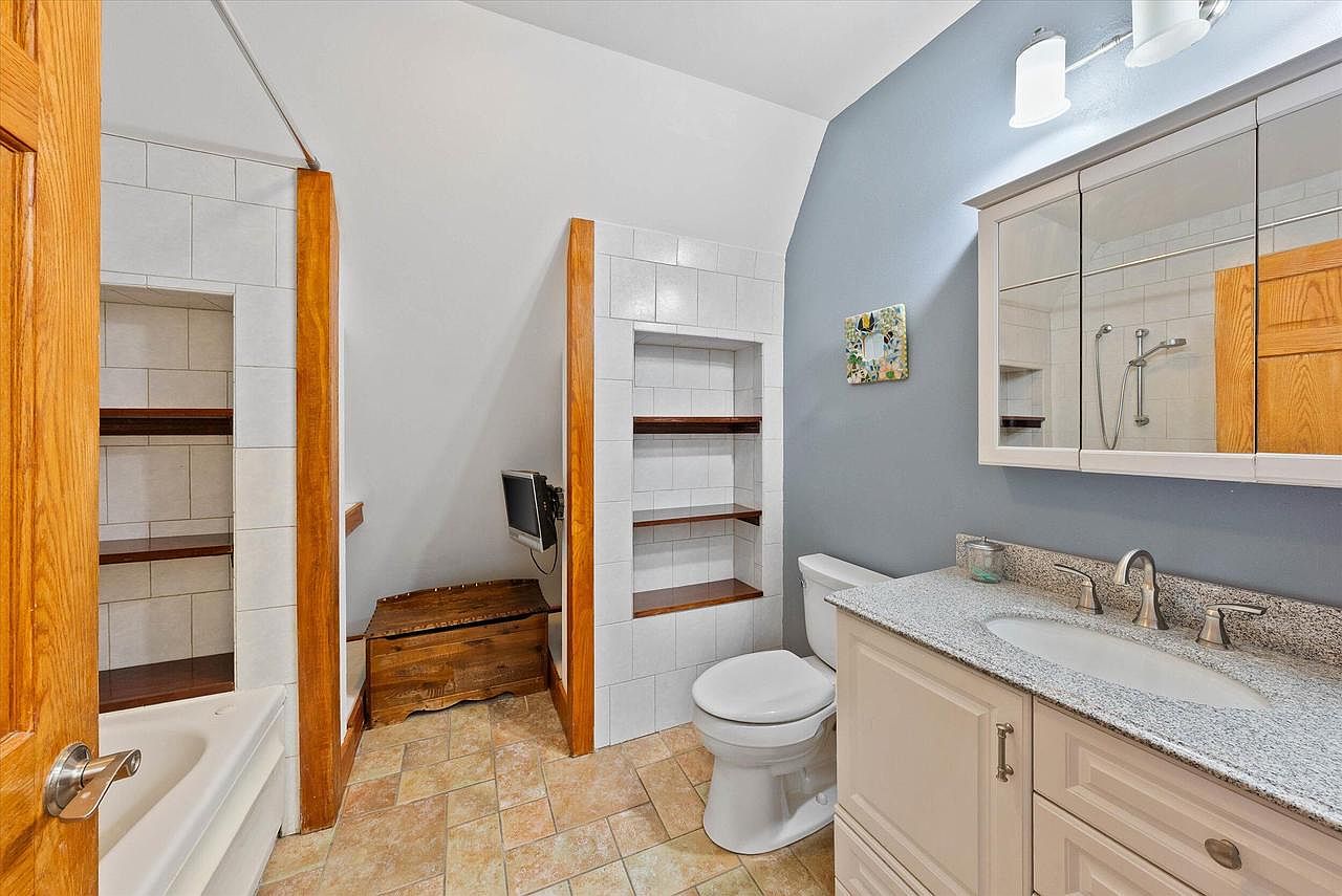 This bathroom features a practical and charming layout with a combination of white tile, warm wood accents, and soft blue-gray walls that add a touch of color and calmness. The white vanity has a speckled granite countertop with a built-in sink, complemented by modern brushed nickel fixtures. Above the vanity is a mirrored medicine cabinet that provides both functionality and light reflection. Opposite the vanity, built-in tiled shelving with wooden shelves offers ample storage for toiletries. The bathroom also includes a white toilet and a bathtub with a tiled surround, while the beige patterned floor tiles ground the space with warmth. The wooden door and trim add a natural element that balances the cool tones throughout the room.