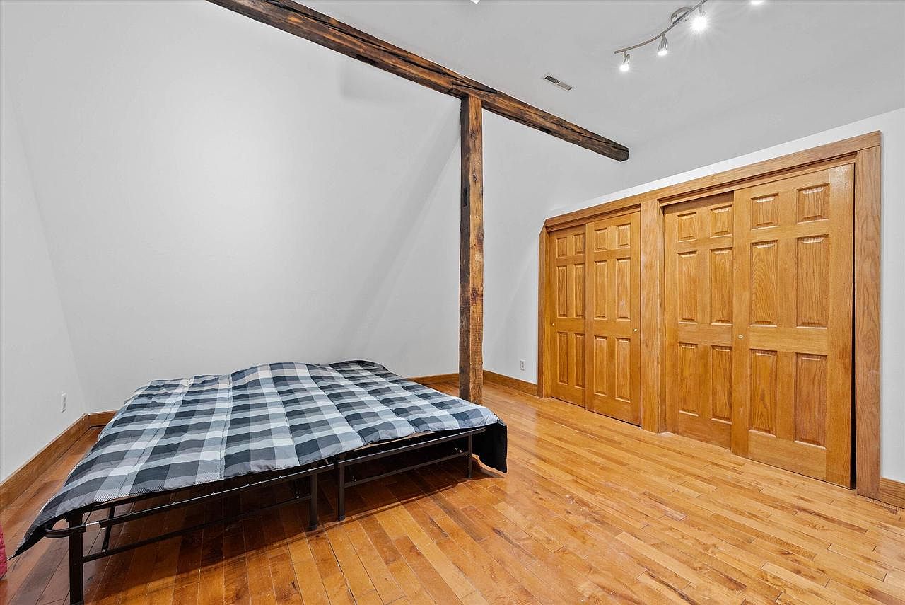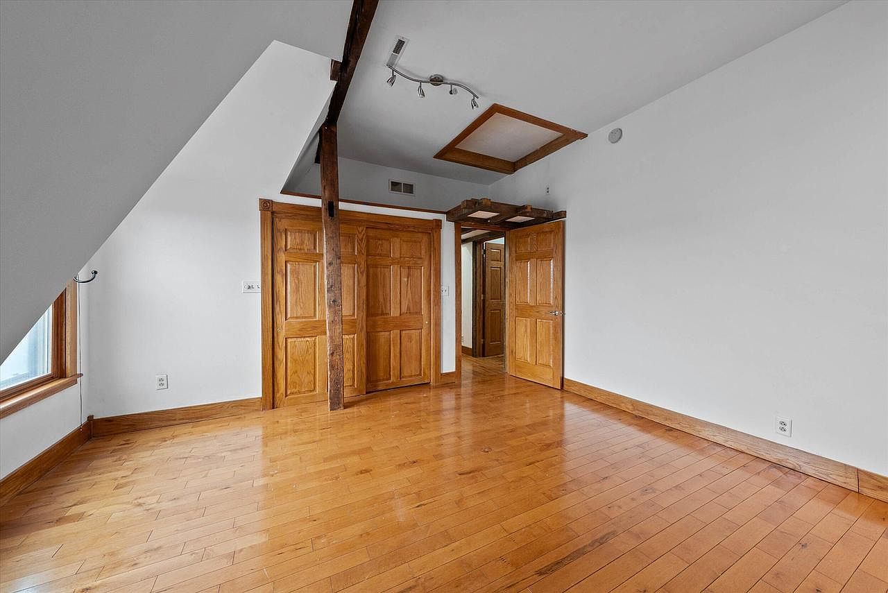 This bedroom features warm honey-toned hardwood floors seamlessly matched with wooden doors and trim that add a natural, rustic charm. The white walls provide a fresh, clean backdrop, enhancing the natural light streaming in through the window on the left. Unique architectural details stand out, including a slanted ceiling on one side and exposed dark wooden beams that create visual interest and structure. The ceiling has a framed inset detail aligning with the doorway, adding character to the space. A versatile closet with double wooden doors offers ample storage, while the open doorway leads to an adjoining area, suggesting a cozy and well-connected living space.