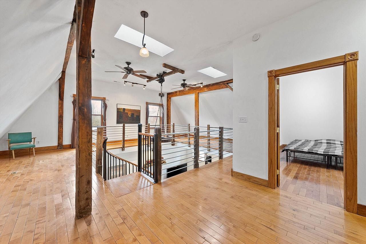 This spacious loft area features warm-toned hardwood floors complemented by exposed rustic wooden beams and white walls that enhance natural light flowing through skylights above. Ceiling fans and track lighting offer modern functionality, while a sleek metal railing with wooden posts surrounds the staircase opening, creating a safe yet open feel. A minimalist green chair sits tucked in one corner adding a subtle pop of color. The open doorway reveals a simple bedroom with matching hardwood floors and a low-profile bed dressed in monochrome plaid bedding, continuing the clean, contemporary aesthetic.
