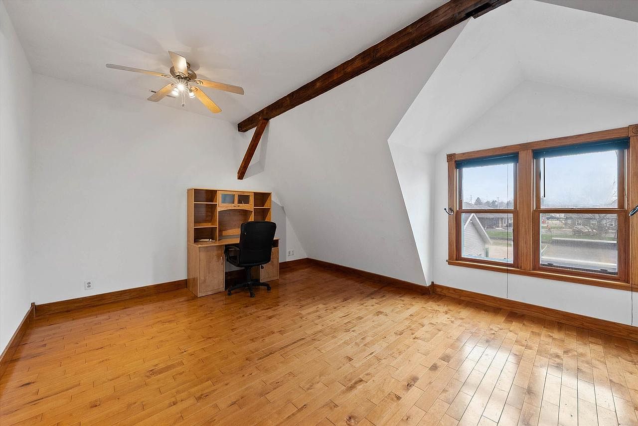 This quiet upstairs nook features a sloped ceiling accented by a prominent dark wooden beam that adds rustic charm against crisp white walls. The warm honey-toned hardwood floor complements the medium wood trim around the large, double window that invites natural light and offers street views. A small built-in wooden desk with storage cubbies and a black swivel chair create a simple, functional workspace. The ceiling fan above provides air circulation, enhancing comfort. The room’s minimal furnishings emphasize openness, making it a versatile spot for focused work or study within the home.