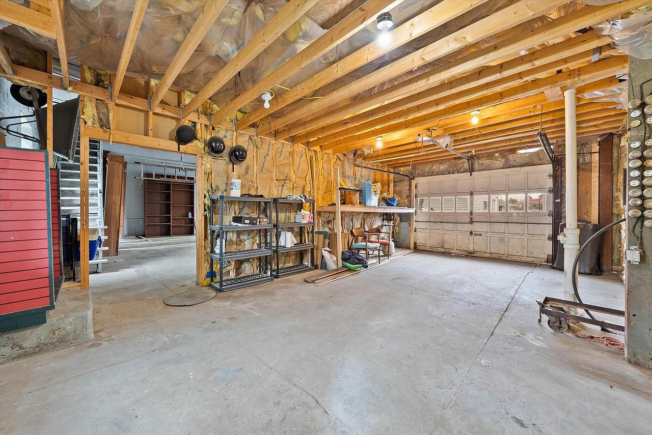 This spacious garage features an unfinished industrial look with exposed wooden ceiling beams and wall insulation revealing the home’s structural elements. The concrete floor is durable and practical for a workshop environment. A large, white sectional garage door with small windows allows natural light while maintaining security. Metal shelving units and a simple, homemade workbench provide practical storage and workspace options. The area is illuminated by bare bulb fixtures hanging from the open ceiling. Connectivity is visible with exposed electrical outlets and conduit, perfect for a handyman’s garage or creative DIY hub.