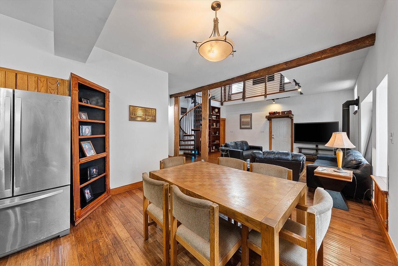 This open-concept space combines dining and living functions with a warm, rustic charm. The wooden dining table, paired with six beige upholstered chairs, sits comfortably on rich, medium-toned hardwood floors, promoting a natural and inviting feel. Adjacent to the dining area is a living corner furnished with black leather sofas arranged around a flat-screen TV and accompanied by a modern side table and lamp. Architectural highlights include exposed wooden beams and a striking spiral staircase leading to an upper level, alongside built-in shelving filled with framed pictures. The stainless steel refrigerator frames the kitchen side, blending contemporary and rustic elements seamlessly with white walls and wooden trims.