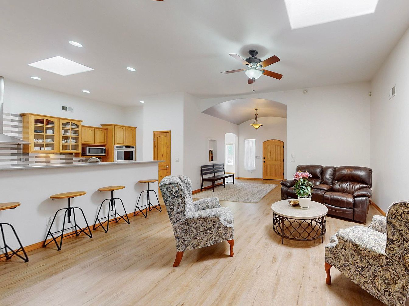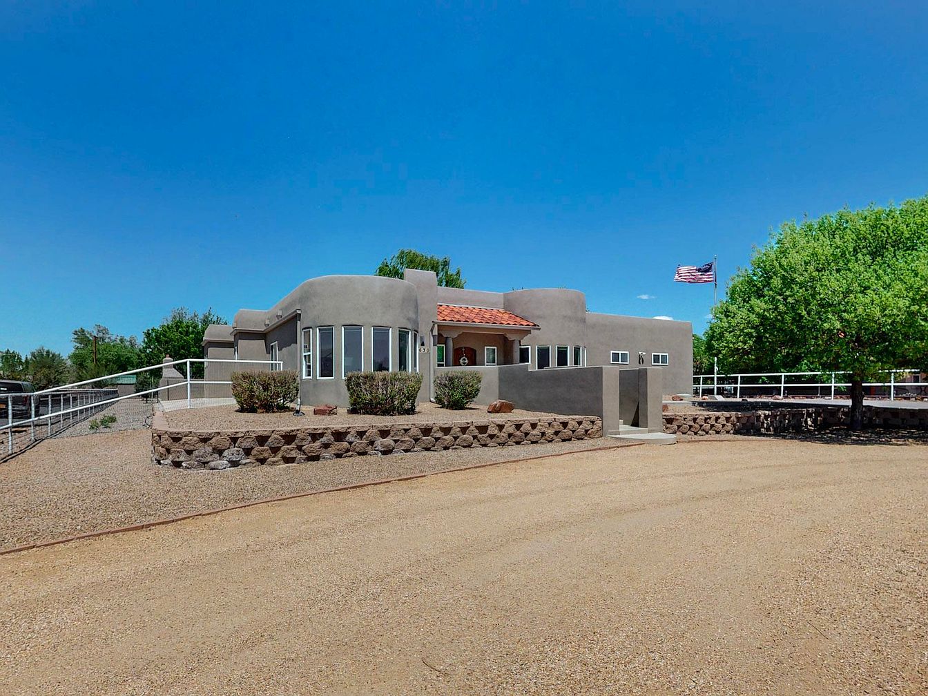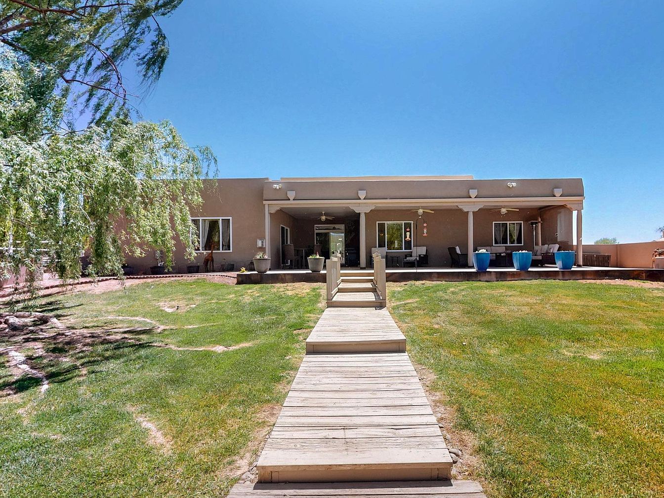 This impeccably maintained home, located in the desirable Bosque Farms area of New Mexico, showcases a distinctive Southwestern architectural style characterized by smooth stucco walls and rounded edges. The residence features a bright, open floor plan with soaring ceilings, dual living areas, and a cozy fireplace, perfect for comfortable living and entertaining. The kitchen is outfitted with high-end quartz countertops, double ovens, and ample counter space, appealing to culinary enthusiasts. The spacious primary suite includes a separate soaking tub and shower, a large walk-in closet, and direct access to a covered patio. There is a secondary suite with an ensuite bath, contributing to a total of five bedrooms. Recent updates enhance the home’s value and durability: stucco and TPO roofing were updated in 2020, porch vigas and gutters refreshed in 2023, a 50-gallon water heater installed in 2024, a 5-zone sprinkler system added in 2021, and new Anderson windows installed in 2025. The property offers a beautifully landscaped yard with backyard access and an inviting covered patio for outdoor entertaining. Listed at $798,000, this home combines modern amenities with classic Southwestern charm.
