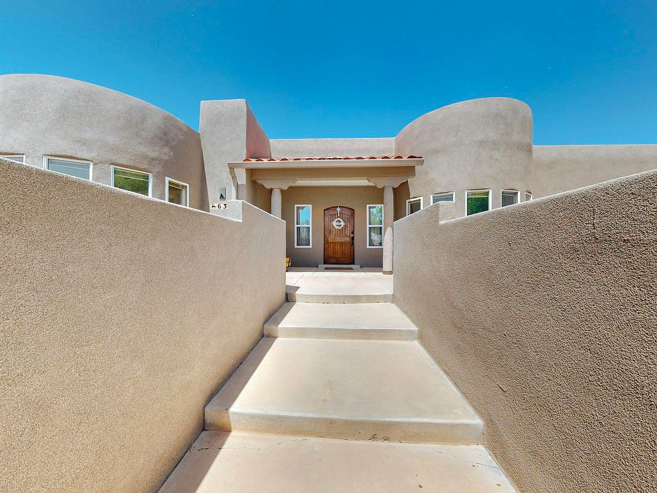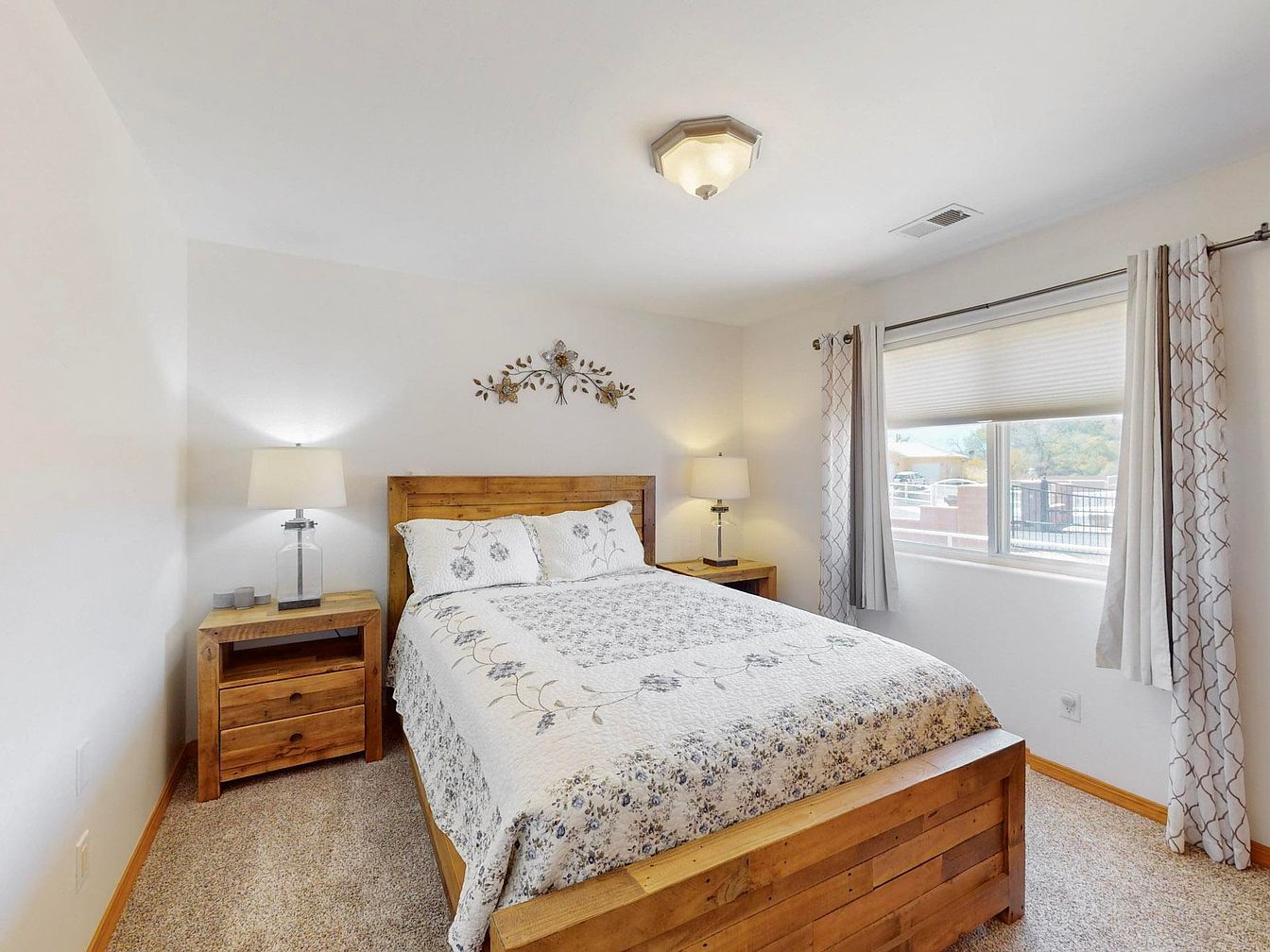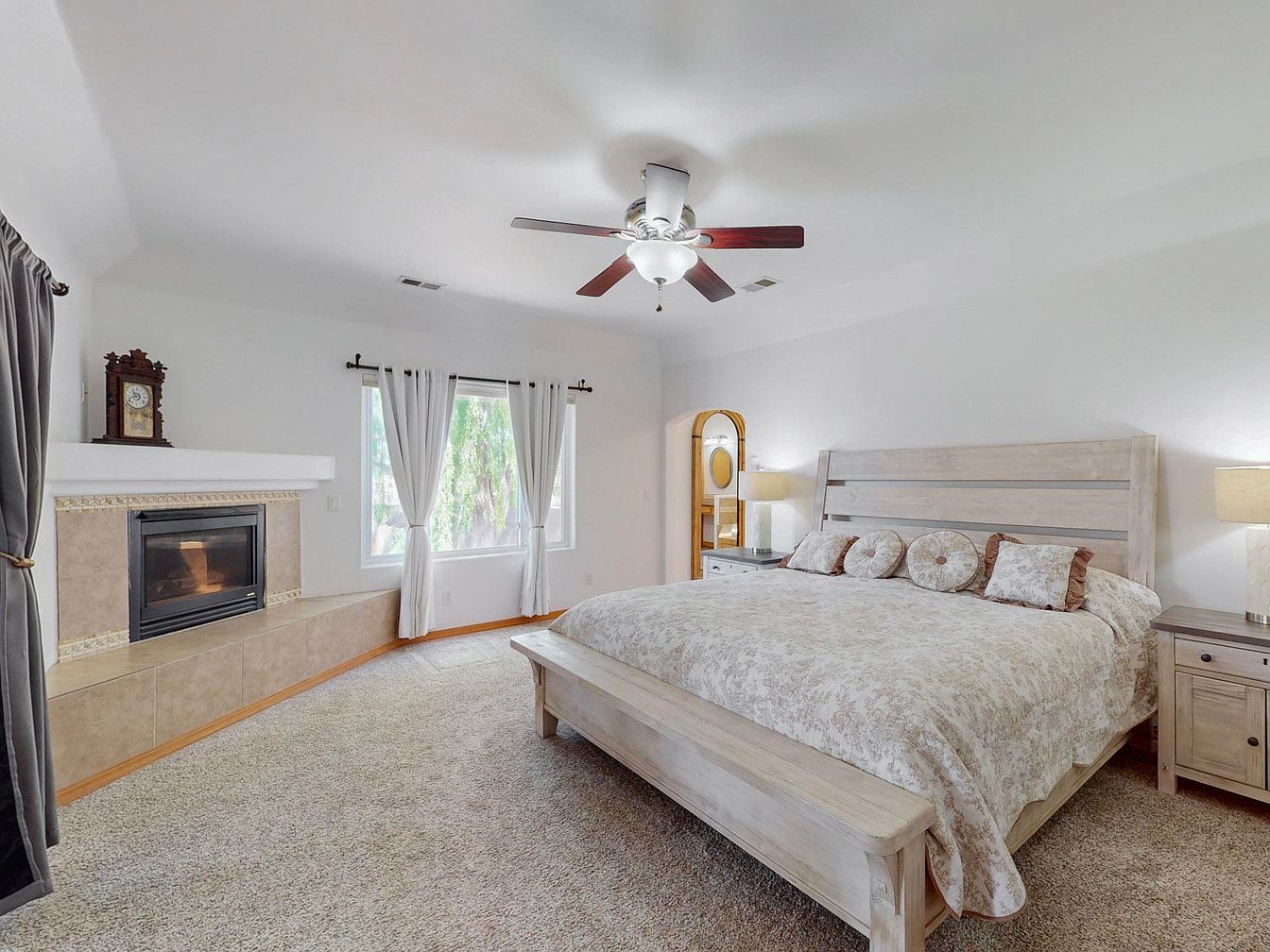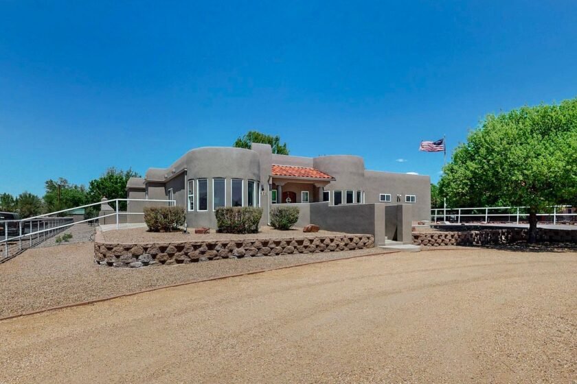 This impeccably maintained home, located in the desirable Bosque Farms area of New Mexico, showcases a distinctive Southwestern architectural style characterized by smooth stucco walls and rounded edges. The residence features a bright, open floor plan with soaring ceilings, dual living areas, and a cozy fireplace, perfect for comfortable living and entertaining. The kitchen is outfitted with high-end quartz countertops, double ovens, and ample counter space, appealing to culinary enthusiasts. The spacious primary suite includes a separate soaking tub and shower, a large walk-in closet, and direct access to a covered patio. There is a secondary suite with an ensuite bath, contributing to a total of five bedrooms. Recent updates enhance the home’s value and durability: stucco and TPO roofing were updated in 2020, porch vigas and gutters refreshed in 2023, a 50-gallon water heater installed in 2024, a 5-zone sprinkler system added in 2021, and new Anderson windows installed in 2025. The property offers a beautifully landscaped yard with backyard access and an inviting covered patio for outdoor entertaining. Listed at $798,000, this home combines modern amenities with classic Southwestern charm.