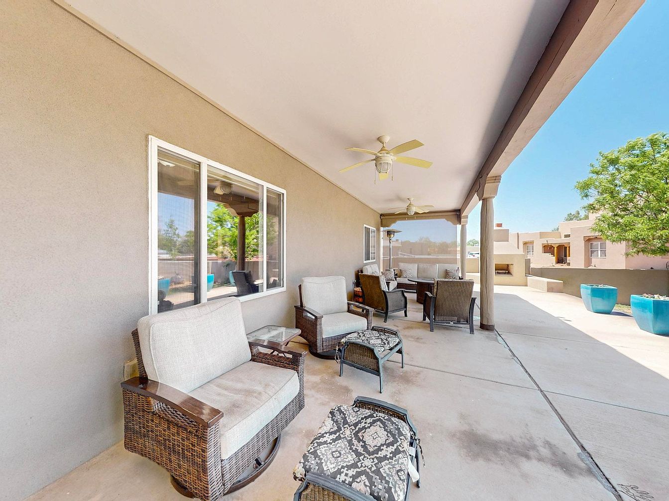 This backyard patio area features a smooth, neutral-toned stucco exterior typical of Southwestern design. A wide wooden walkway leads from the green lawn up to the elevated covered porch, creating a welcoming path. The patio space is spacious with comfortable seating areas on either side, shaded by a flat roof supported by simple columns. Large blue ceramic planters add a pop of color and enhance the relaxed outdoor vibe. Ceiling fans overhead promise comfort on warm days. The large windows and sliding door connect indoor living with this inviting outdoor retreat.