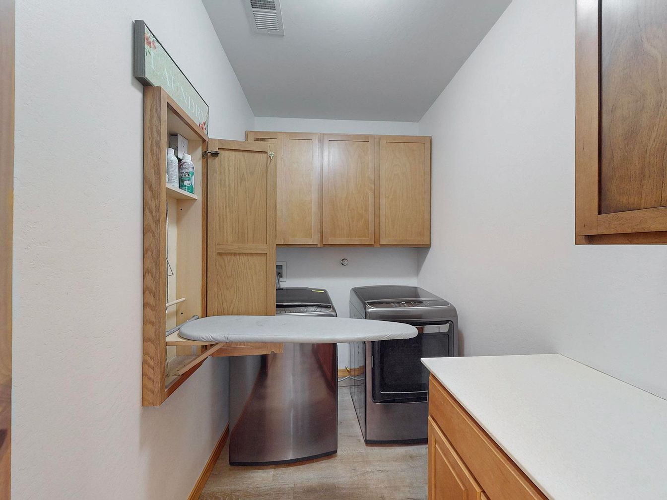 This laundry room is thoughtfully designed with functionality and simplicity in mind. Stainless steel front-loading washer and dryer sit side by side along the far wall, beneath a set of natural wood cabinets that provide ample storage. Neutral, light-colored walls and light wood laminate flooring create an airy atmosphere. A convenient fold-away ironing board is mounted on the left wall, framed by a small shelf unit for laundry supplies. On the right, a white countertop atop more wooden cabinetry offers space for folding clothes or organizing laundry essentials. Clean lines and warm wood tones give the space a balanced, practical charm.
