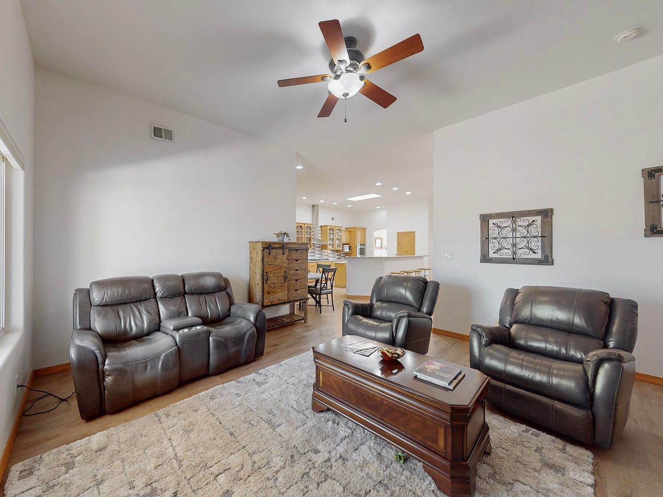 This family room features a cozy seating arrangement with two leather armchairs and a matching leather sofa, all in a dark gray tone that contrasts subtly with the light walls. The space is anchored by a large textured area rug in neutral shades, adding warmth and softness to the wood flooring beneath. A polished wooden coffee table stands in the center, decorated with books and small items for an inviting touch. The walls are painted white, enhancing the open and airy feel, while wood trim accents the room. A ceiling fan with wooden blades centers the high ceiling, and the adjacent kitchen is visible, suggesting an open-concept layout.