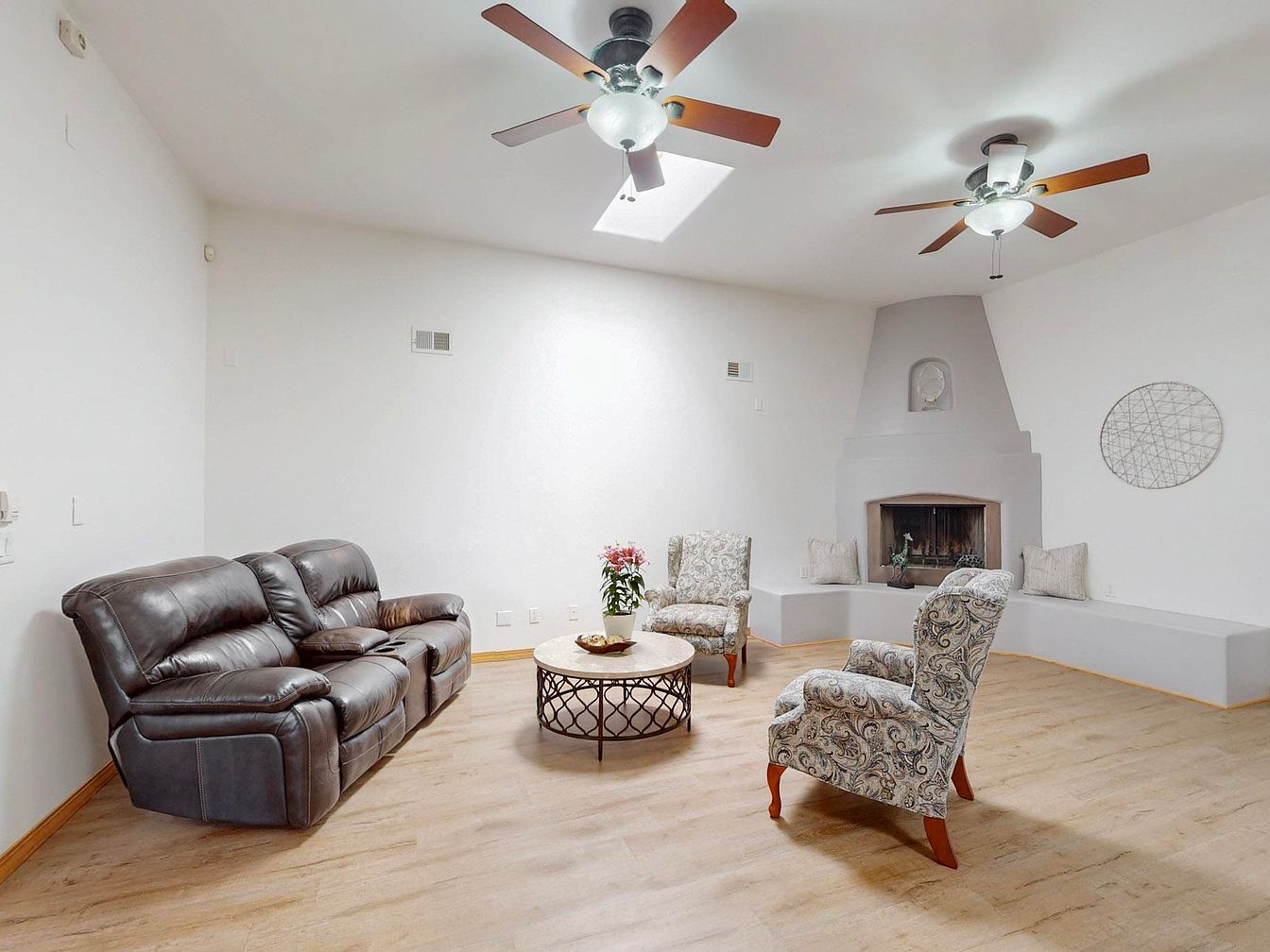 This living room features a spacious, minimalist design with light wood flooring that complements the neutral white walls. The seating arrangement centers around a round coffee table with a patterned metal base, surrounded by a dark brown leather recliner sofa and two upholstered armchairs with a classic floral pattern and wooden legs. An architecturally distinct kiva-style fireplace with built-in seating wraps around one corner, creating a cozy focal point. Overhead, two ceiling fans with wooden blades and frosted glass lights contribute to comfort and ventilation. The room is brightened naturally by a ceiling skylight, enhancing the airy, inviting atmosphere.