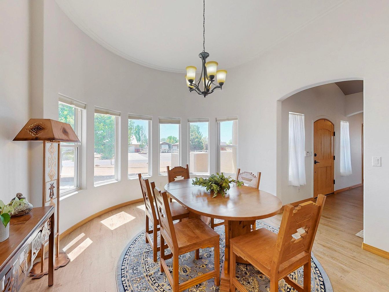 This charming dining area features a rounded wall lined with tall windows that flood the space with natural light. The warm wooden dining table and matching chairs with Southwestern-inspired carvings add a rustic touch, complemented by a patterned area rug that anchors the seating. Soft white walls and light wood flooring create a neutral, airy backdrop, while the arched entryway and wooden door introduce subtle architectural interest. A wrought iron chandelier with frosted glass shades hangs above, providing soft overhead illumination, making this an inviting spot for meals and gathering.