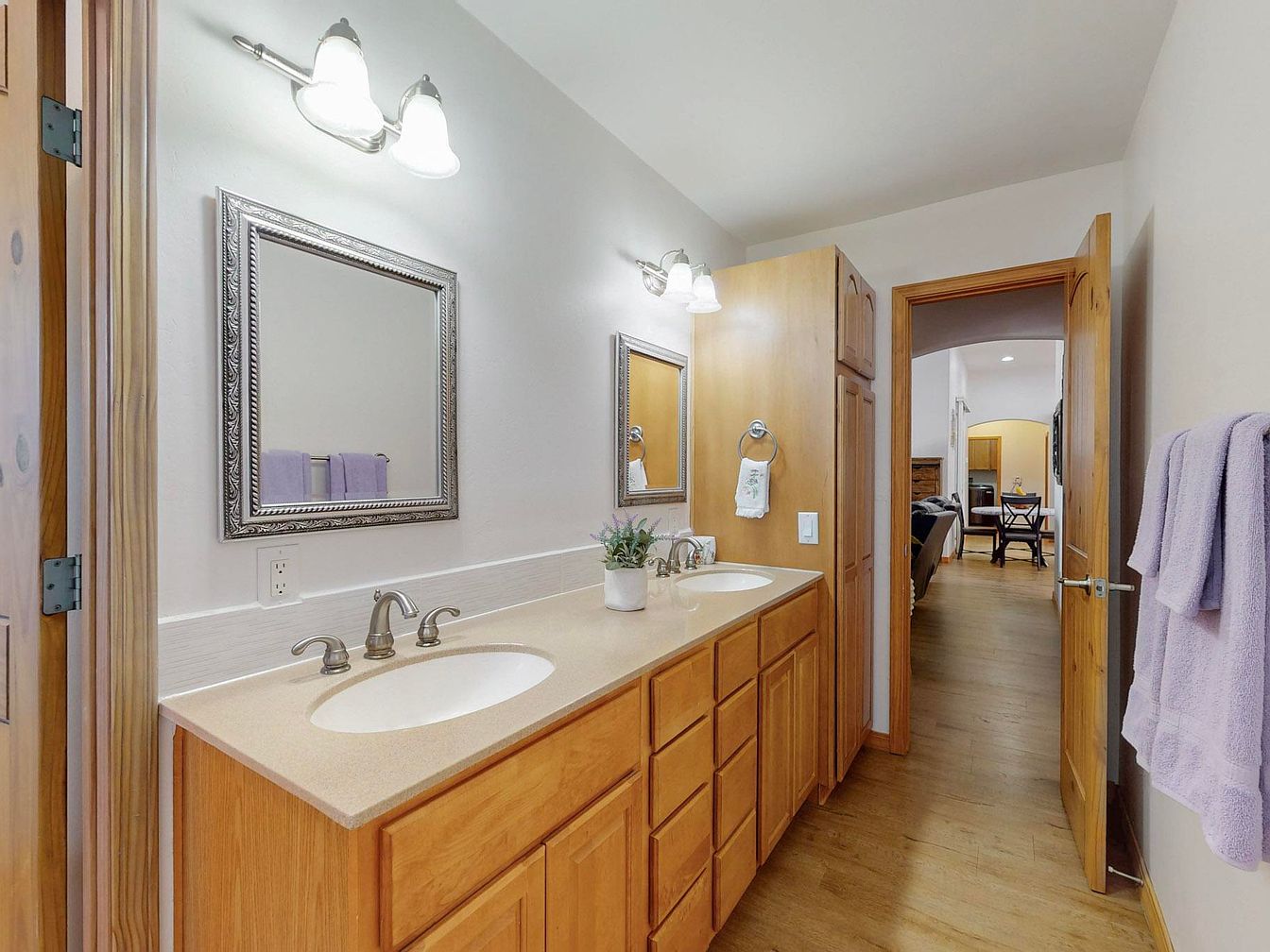 This bathroom features a long double-sink vanity with light wood cabinetry that offers plenty of storage space. The countertops are smooth and light-colored, complementing the natural finish of the cabinets. Above each sink, there are matching silver-framed mirrors, well-lit by classic wall-mounted light fixtures with frosted glass shades. The walls are painted a clean, soft white, enhancing the room’s bright and airy feel. On the right, a wooden door leads to the hallway, visible through the doorway, connecting this private area to the rest of the home. Lavender towels and a small potted plant add subtle pops of color and a touch of freshness to the simple, functional design.