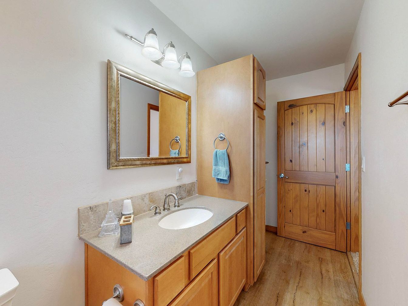 This bathroom space features a single vanity with light wood cabinetry topped by a smooth, light gray countertop that includes an under-mount sink. Above, a framed rectangular mirror with a gold-toned border adds subtle elegance. The wall-mounted lighting fixture above the mirror consists of three white frosted glass shades, providing soft illumination. A tall cabinet offers vertical storage space beside the vanity, blending seamlessly with the cabinetry. The flooring is a warm-toned wood finish that complements the matching wooden door with rustic knot details. The walls are painted a clean white, fostering a bright and airy atmosphere.