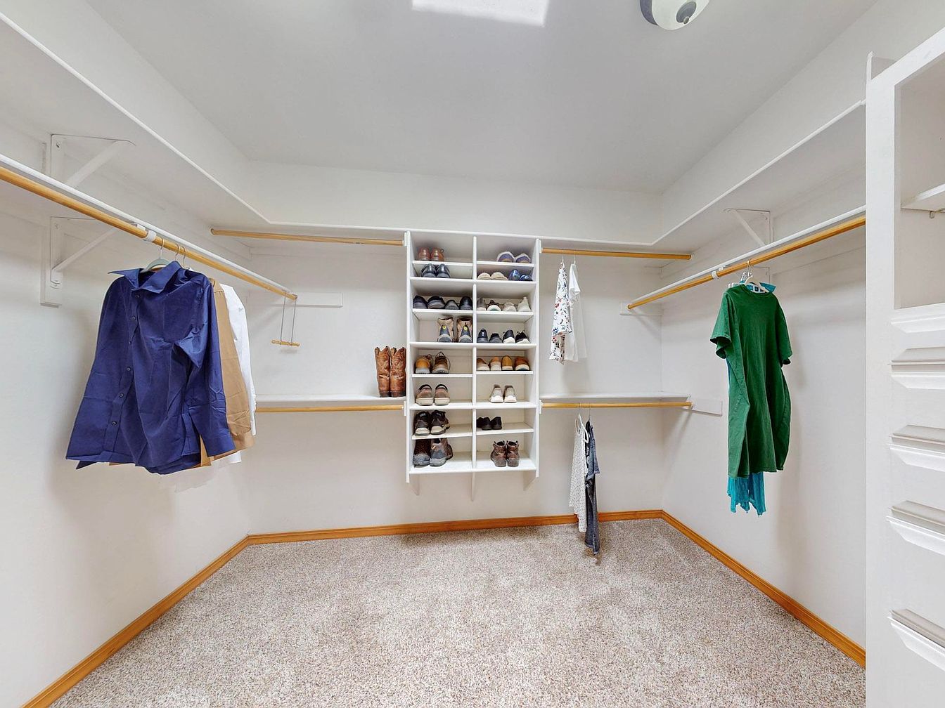 This spacious walk-in closet features a well-organized layout with multiple wooden hanging rods arranged on three sides, offering ample space for clothing storage. The room is painted bright white, which enhances the natural light and creates a clean, airy atmosphere. A central white shelving unit is dedicated to an extensive shoe collection, showcasing various pairs neatly arranged on open cubbies. The beige carpet flooring adds warmth and comfort underfoot, while the natural wood baseboards and hanging rods introduce subtle contrast and a touch of rustic charm. Minimal clothing displayed keeps the space functional and inviting.