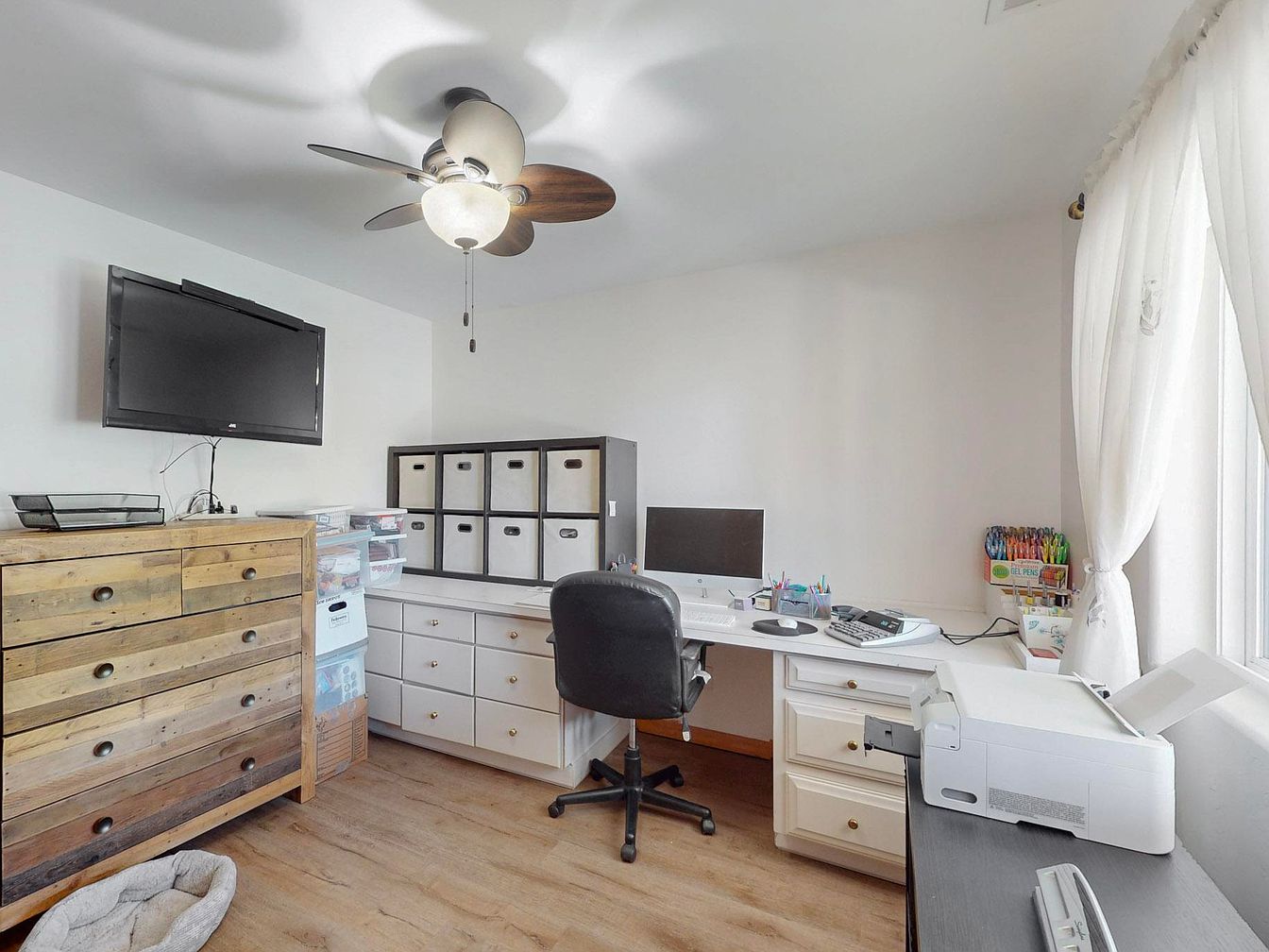 This well-organized home office features a clean white built-in desk that stretches along two walls, offering ample workspace. A black office chair sits centrally, facing a desktop computer, with various writing tools and office supplies neatly arranged. To the left, a rustic wooden chest of drawers adds warmth and texture, balancing the modern white cabinetry. A wall-mounted flat-screen TV is positioned above the dresser, providing entertainment or secondary display options. Natural light filters softly through sheer white curtains on a large window, enhancing the airy feel. Overhead, a ceiling fan with wooden blades adds both style and functionality, complementing the light wood flooring and neutral palette.