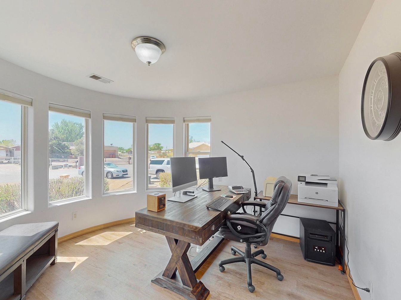 This cozy home office is bathed in natural light from a distinctive curved wall lined with five tall windows, offering a panoramic view of the outdoors. The space features a sturdy rustic wooden desk with an X-shaped base, paired with a black leather rolling office chair for comfort. On the desk are dual monitors, a modern desk lamp, and various office essentials. Light wood floors complement the neutral white walls and ceiling, creating a bright and airy atmosphere. A bench with storage sits beneath the windows, while a minimalist secondary table at the back holds a printer and additional equipment. A round wall clock adds a subtle touch to the clean, functional design.