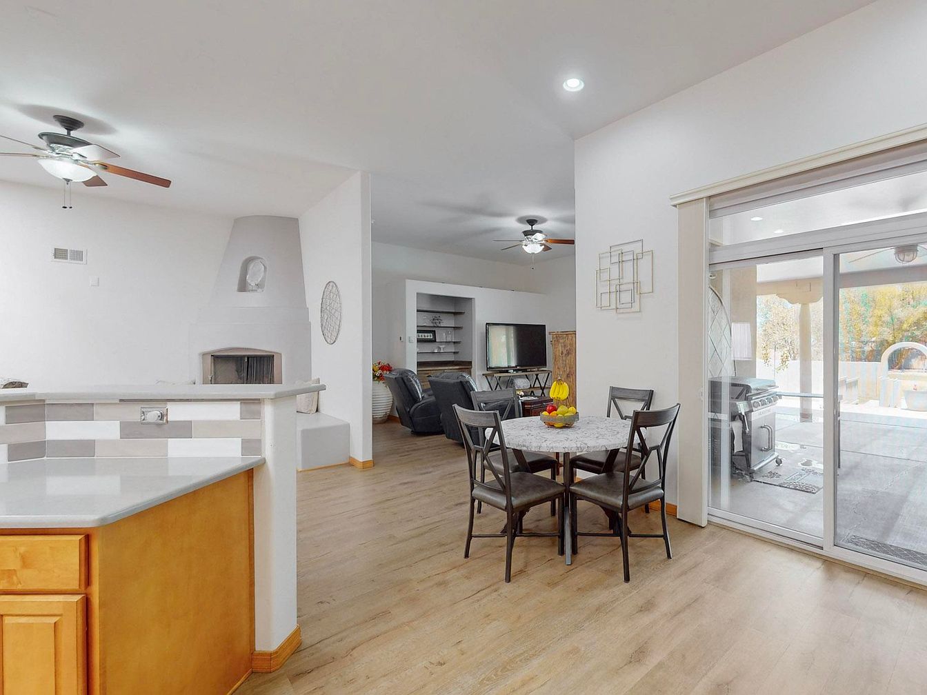 This open-concept dining nook seamlessly blends into the adjacent living room, creating a cohesive and airy communal space. The light wood flooring complements the neutral color palette of whites and soft grays, enhanced by natural light streaming through large sliding glass doors that lead to an outdoor patio. A round dining table with dark metal chairs sits near the glass doors, offering a cozy spot for meals. The living room features comfortable dark leather recliners facing a TV, while a distinctive built-in fireplace with a curved niche adds architectural interest. Ceiling fans provide functional style and airflow.