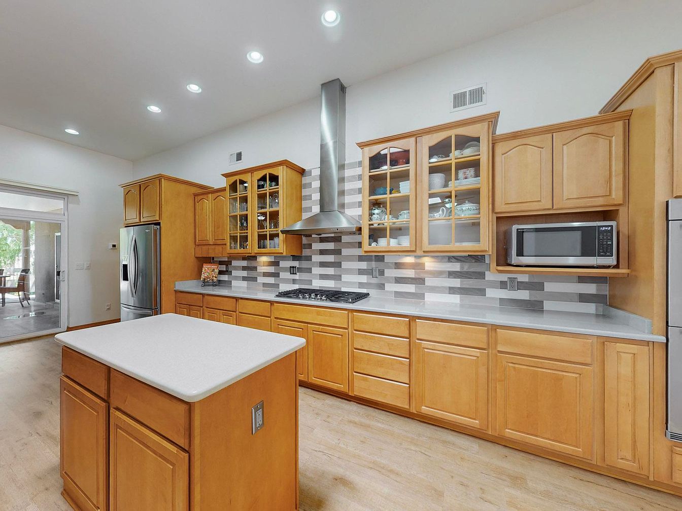 This spacious kitchen features a central island with a smooth, light-colored countertop that complements the warm honey-toned wooden cabinetry throughout the space. The cabinetry includes a mix of solid and glass-front doors, offering both ample storage and a display for decorative dishes. A modern stainless steel range hood sits above a built-in cooktop, set against a backsplash of horizontal gray and white tile that adds subtle texture and contrast. Recessed ceiling lights provide bright, even illumination, while the natural wood flooring ties the design elements together with a cohesive, inviting feel.