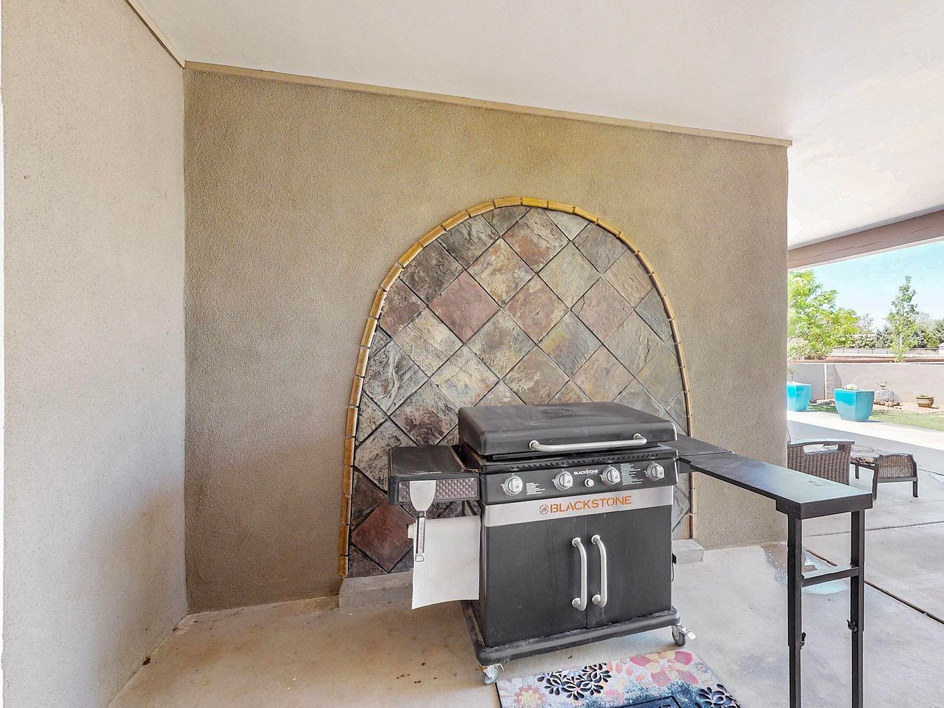 This cozy outdoor cooking space features a sturdy Blackstone gas grill positioned against a textured beige stucco wall. Behind the grill, a decorative tiled backsplash with a diamond pattern is framed in an arched design bordered by bamboo-style trim, adding a rustic yet artistic touch. The concrete floor anchors the space practically, while the adjacent patio area opens up to a bright, inviting backyard. The neutral earth tones of the wall and tiles complement the sleek black grill, creating a balanced and functional outdoor culinary retreat perfect for entertaining or casual meals.