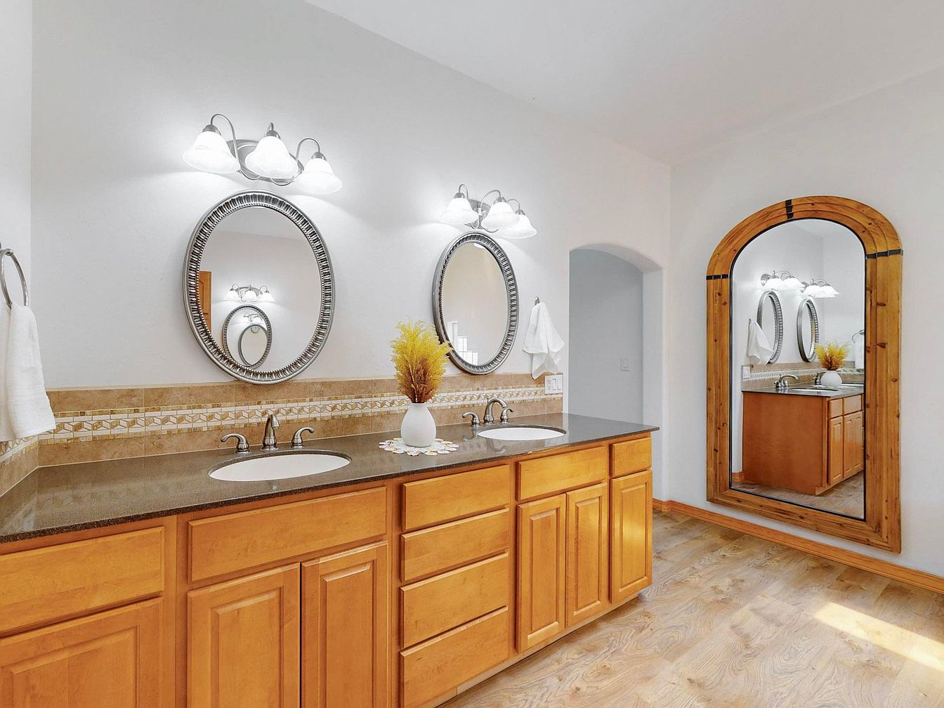 This bathroom features a double-sink vanity with warm wooden cabinetry and a smooth, dark countertop. Above the sinks are two ornate oval mirrors with silver-toned frames, each illuminated by triple-light fixtures that provide soft, even lighting. A decorative tile backsplash in neutral earthy tones adds texture and complements the cabinetry’s honey finish. The flooring is a light wood-look, enhancing the room’s brightness and natural feel. A large, arched full-length mirror with a matching wooden frame is positioned opposite the vanity, reflecting the space and amplifying light. Clean white walls and subtle decor, including a white vase with dried yellow flowers, impart a fresh and inviting atmosphere.