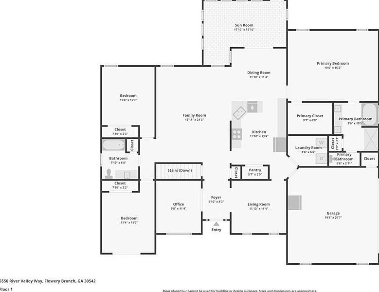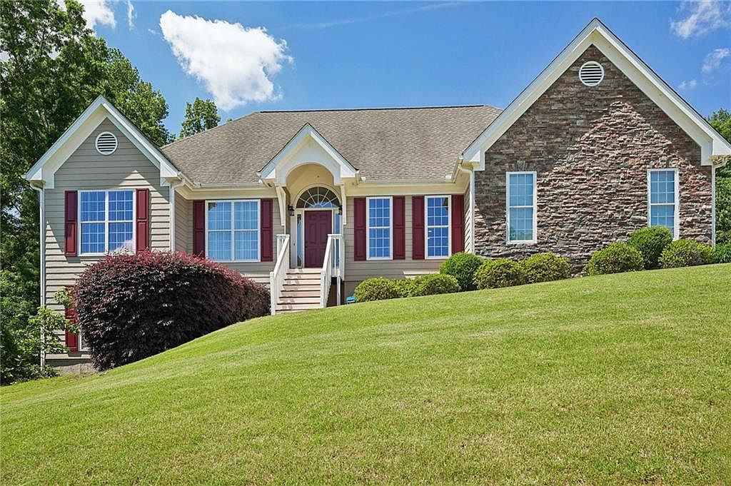 This charming single-story home in Flowery Branch, GA, showcases a modern traditional architectural style characterized by a combination of siding and stone exterior finishes, gabled rooflines, and clean, classic detailing. Nestled on a spacious 1.23-acre lot, this 3-bedroom, 2-bath residence offers abundant outdoor and indoor living spaces. Inside, the home features a formal foyer leading into spacious living and dining rooms. A separate living area with double glass French doors is perfect for an office or quiet retreat. The primary suite impresses with tall tray ceilings, a massive walk-in closet, and a double vanity bathroom featuring a separate tub and shower. Two additional well-sized bedrooms share a spacious bathroom with a tub/shower combination. The full unfinished basement includes plumbing, walkout access to the yard, and plenty of natural light, offering considerable potential for customization and expansion. The exterior is fully fenced, including a large one-car garage for storage and an elongated driveway for easy pull-around access, RV, boat, or motorcycle parking. Listed at $564,990, this home blends comfort, functionality, and natural beauty in a highly sought-after location.