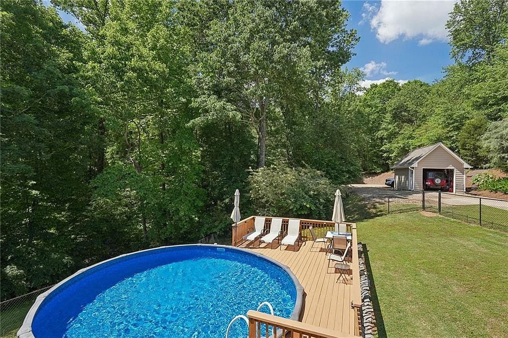 This inviting backyard space features an above-ground circular pool surrounded by a wooden deck with safety railings. Four cream-colored lounge chairs line one side of the deck, providing ample seating for relaxation under the two beige patio umbrellas. The area is bordered by dense green trees, creating a serene, private atmosphere. The well-maintained lawn extends toward a detached garage visible in the background, which sits beside a gravel driveway. The use of natural wood tones and lush greenery enhances the tranquil, outdoor retreat vibe of this family-friendly space.