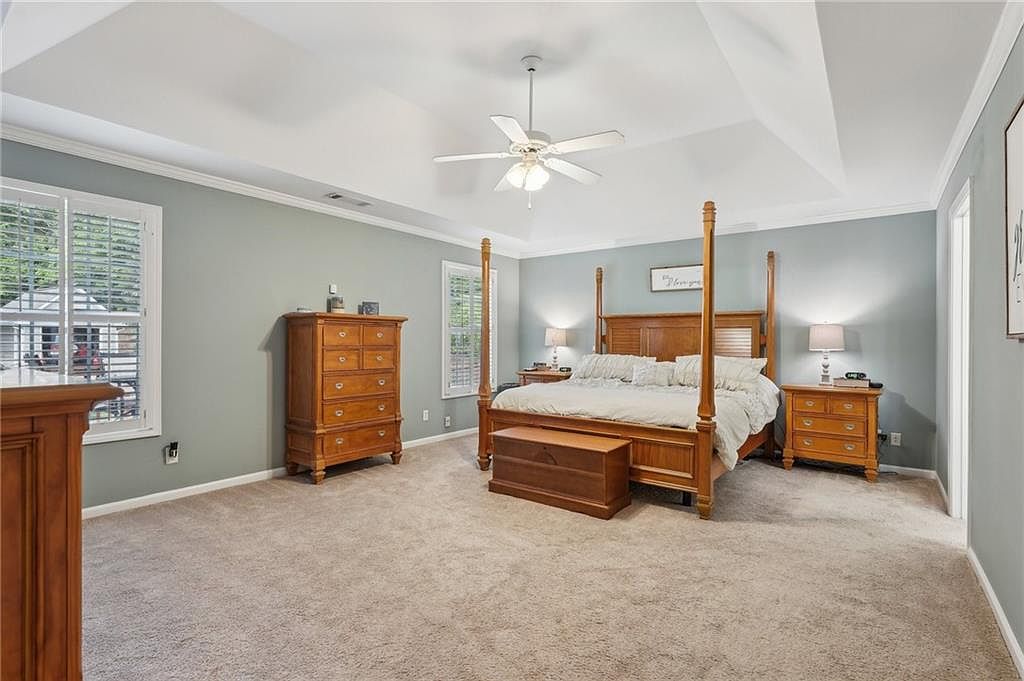 This master bedroom offers a serene retreat defined by soft blue-gray walls that complement warm wood furnishings. The room centers on a large four-poster bed adorned with white bedding and multiple pillows, creating an inviting feel. Matching wooden nightstands with lamps on either side enhance symmetry and warmth, while the tall dresser and blanket chest add classic storage solutions. Plush beige carpeting covers the floor, contributing texture and comfort. Natural light filters through white plantation shutters on two windows, balancing coziness with brightness. A ceiling fan with lights completes the high, vaulted ceiling design for comfort and style.
