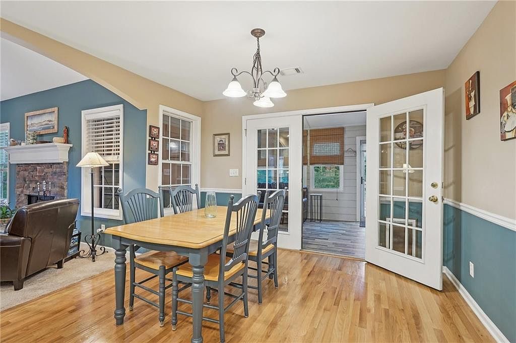 This inviting dining space centers around a wooden table with turned, blue-painted legs complemented by matching chairs with natural wood seats. The warm honey-toned hardwood floor adds a cozy foundation, contrasting with the two-tone wall paint: a soft beige upper half and muted blue wainscoting. A classic chandelier with white glass shades hangs overhead, providing balanced illumination. The room connects openly to an adjacent living area, partially visible with a stone fireplace and leather furniture, while French-style doors with glass panes lead to a sunroom, emphasizing natural light and a seamless indoor-outdoor feel. Traditional decor pieces and framed art complete the homely ambiance.