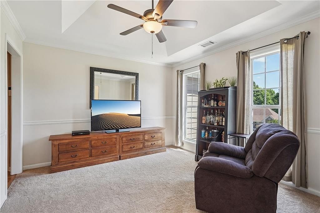 This inviting sitting room features a neutral color palette with beige walls complemented by white crown molding and chair rail trim, creating a subtle contrast. The plush, dark brown recliner offers a comfy seating option oriented toward the wooden media console, which anchors the space with its rich, natural wood tones and multiple drawers for storage. A sleek flat-screen TV sits atop the console, perfectly positioned below a large framed mirror that reflects light and adds depth. Two tall windows dressed in light beige curtains bring natural light into the room, highlighting the cozy carpeted flooring. A dark wooden cabinet filled with various bottles adds character and a hint of personalization to the room.