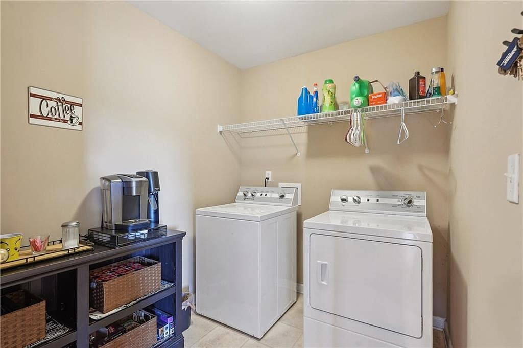 This laundry room features a practical layout with a washer and dryer set placed side by side against a neutral beige wall. Above, a single white wire shelf provides storage for laundry essentials, including detergent bottles and cleaning supplies, with some empty hangers available for air-drying clothes. To the left, a dark wood linen cabinet offers additional storage space with woven baskets, enhancing organization and warmth in the room. The floor is tiled in a light color, complementing the overall clean, functional, and simplified aesthetic, with a charming coffee station adding a unique, personal touch.
