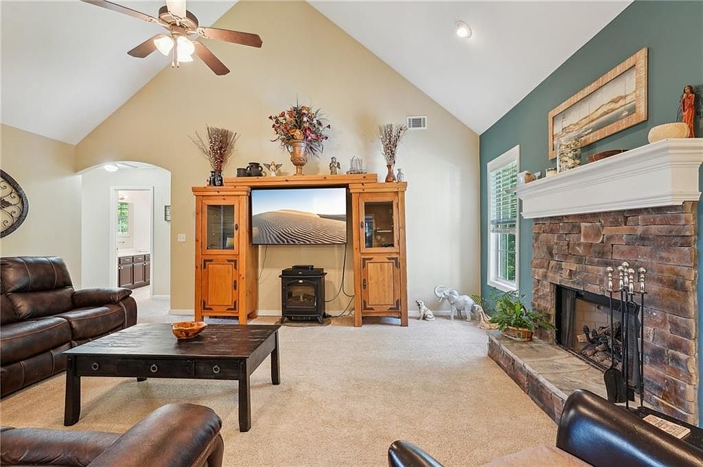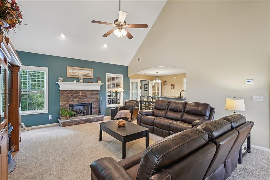 This living room features an open layout with vaulted ceilings, allowing ample natural light from multiple windows. The focal point is a rustic stone fireplace set against a teal accent wall that contrasts beautifully with the neutral beige walls surrounding the space. Plush carpet covers the floor, enhancing comfort and warmth. The seating arrangement includes dark brown leather reclining sofas positioned around a sturdy black coffee table, perfect for gatherings or relaxation. The room seamlessly connects to a dining area through a wide arched opening, maintaining a spacious and inviting atmosphere. Ceiling lighting and a fan complete the cozy yet functional aesthetic.
