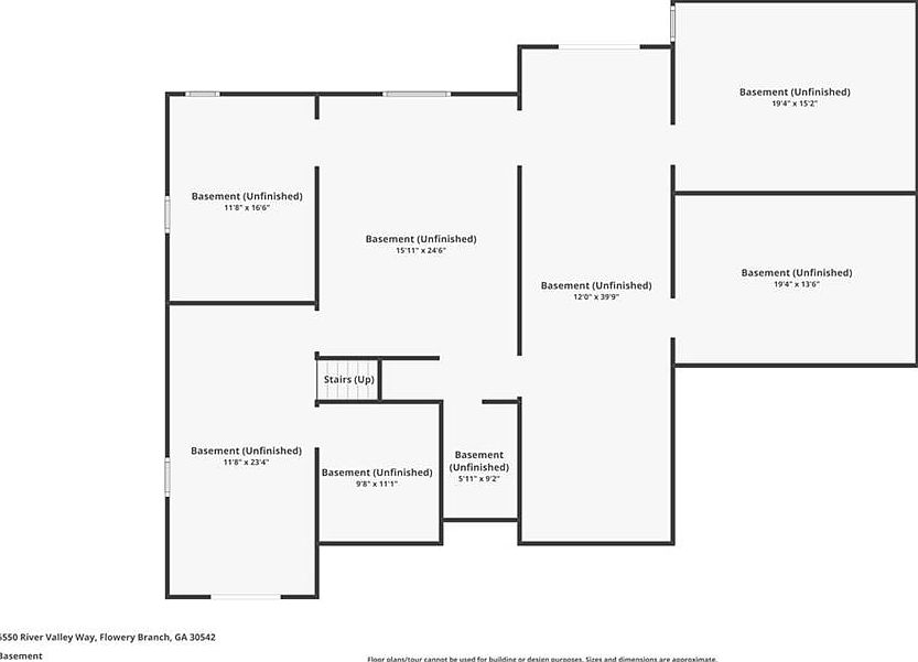 This basement layout reveals a spacious, unfinished area divided into multiple sections with clear rectangular boundaries. The design shows potential for versatile use, featuring seven distinct rooms offering a wealth of customizable space. Dimensions are generous, with areas ranging from 5’11” by 9’2″ to a large 12’0″ by 39’9″ expanse. The central staircase leads up to the main level, anchoring the floor plan’s flow. Walls segment the basement thoughtfully, allowing possibilities for storage, recreation, or future finished rooms, all within a clean, functional footprint designed for practical adaptability.