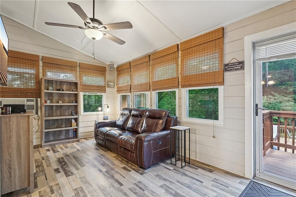This bright sunroom features a vaulted ceiling with white paneled walls that create an airy, spacious feeling. Large windows wrapped in natural woven shades allow an abundance of natural light while maintaining privacy. The focal point is a rich dark brown leather reclining sofa paired with a minimalist black metal side table, offering a cozy spot to relax while enjoying views of the surrounding greenery. The floor is covered with a multi-tone wood plank design, offering warm, rustic charm that enhances the natural vibe. Sliding glass doors lead to an outdoor deck, seamlessly connecting indoor and outdoor living. Ceiling fan lights provide functional illumination and climate control.