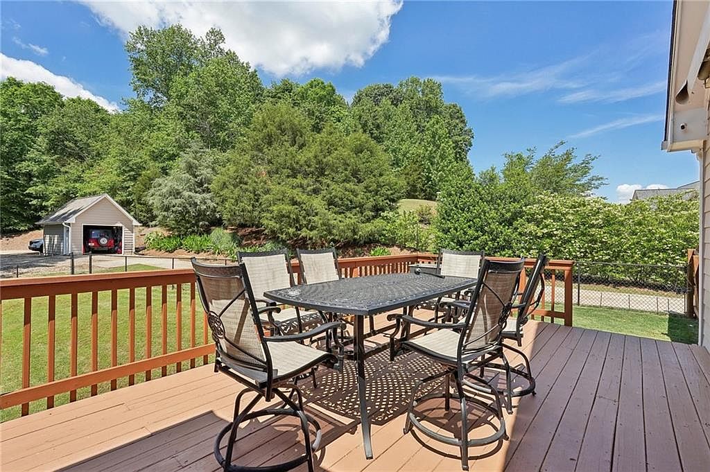This spacious wooden deck offers an inviting outdoor dining area with a sturdy rectangular metal table and six matching chairs, each featuring beige mesh seating and armrests with black metal frames. The deck is surrounded by a wooden railing that enhances safety while providing an open view of the lush green backyard adorned with tall trees and shrubbery. In the distance, a detached garage or shed with a red vehicle inside adds a practical element to the serene environment. The bright blue sky with scattered clouds completes the tranquil outdoor setting, perfect for gatherings and relaxation.