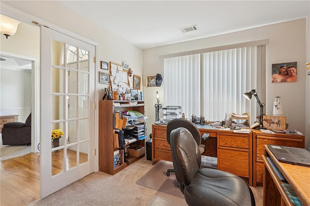 This home office features a functional, cozy layout with a classic touch. The L-shaped oak desk offers plenty of workspace, accompanied by black leather office chairs on casters for comfort and mobility. Neutral beige carpeting contrasts with the natural wood tones of the desk and shelving unit filled with paperwork and office supplies. White vertical blinds cover the large window, allowing controlled natural light. The white walls are adorned with personal photos and organized notes pinned on a corkboard, adding a personal touch. A traditional French door with glass panels opens to an adjacent room with hardwood flooring, enhancing the open, airy feel.