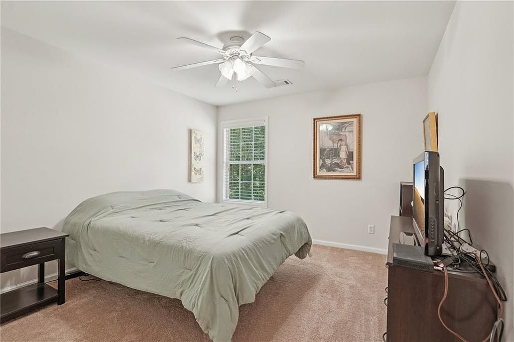This bedroom features a clean and minimalist aesthetic with soft, neutral tones. The walls are painted a bright white, complementing the light brown carpet that adds warmth to the room. A double bed, dressed with a muted sage green comforter, is positioned under a ceiling fan with integrated lighting. Natural light filters through a window with white blinds, brightening the space and offering a view of greenery outside. Dark wood furniture pieces, including a nightstand and a dresser topped with a flat-screen TV, contrast nicely with the light walls and carpet. Simple framed artwork adds subtle personality while maintaining a calm, uncluttered atmosphere.
