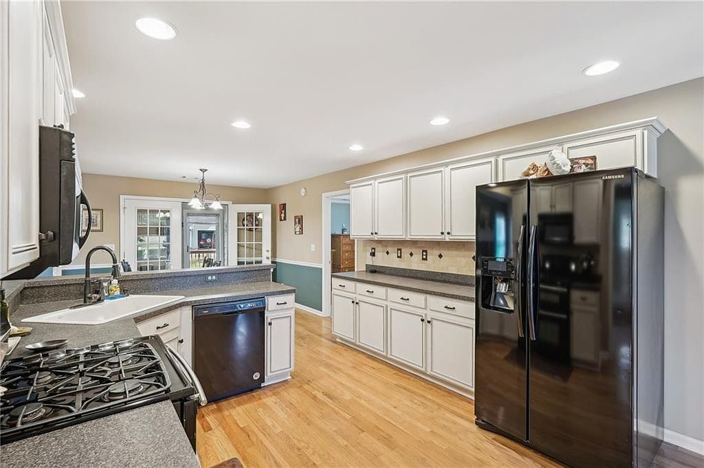 This kitchen boasts a spacious, open layout with ample cabinetry along one wall, painted in a classic white with simple black knobs that complement the sleek black appliances. The countertops are a smooth gray, providing a neutral contrast to the warm, honey-toned hardwood flooring. A peninsula with a built-in sink and dishwasher creates a natural division between the kitchen and adjacent dining or living area. Recessed ceiling lights ensure even, bright illumination. The far wall features a pair of French doors leading outside, enhancing the room’s airy feel and adding to the inviting traditional-modern aesthetic.