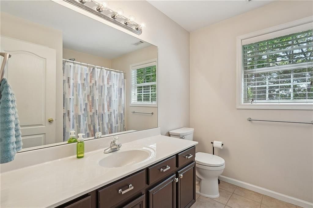 This bathroom features a clean and practical layout with a single sink vanity topped with a smooth, white countertop. The dark wood cabinetry offers contrast to the light beige walls and flooring, creating a balanced, warm aesthetic. A large frameless mirror spans the length of the vanity, enhancing the sense of spaciousness. To the right, a white toilet sits beneath a window with white blinds, allowing natural light to filter in and brighten the space. A neutral-toned shower curtain with soft geometric patterns completes the look, contributing to the bathroom’s modern yet inviting atmosphere.