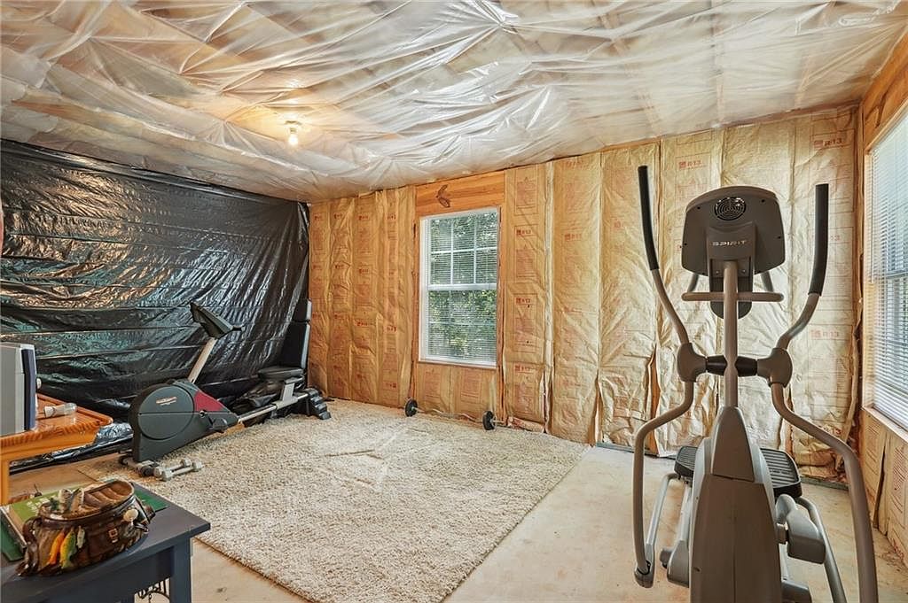 This room is serving as a home gym in a partially finished basement or workout area. The walls reveal exposed insulation with plastic sheeting, giving an industrial, unfinished vibe. Natural light filters through two windows, brightening the space. Exercise equipment including a recumbent bike and elliptical machine are positioned thoughtfully for workout convenience. A beige shaggy rug covers part of the concrete floor, adding texture and warmth. The ceiling also shows protective plastic, reinforcing the unfinished state. Despite the raw surroundings, the area is functional, designed for fitness activities in a straightforward, practical setting.
