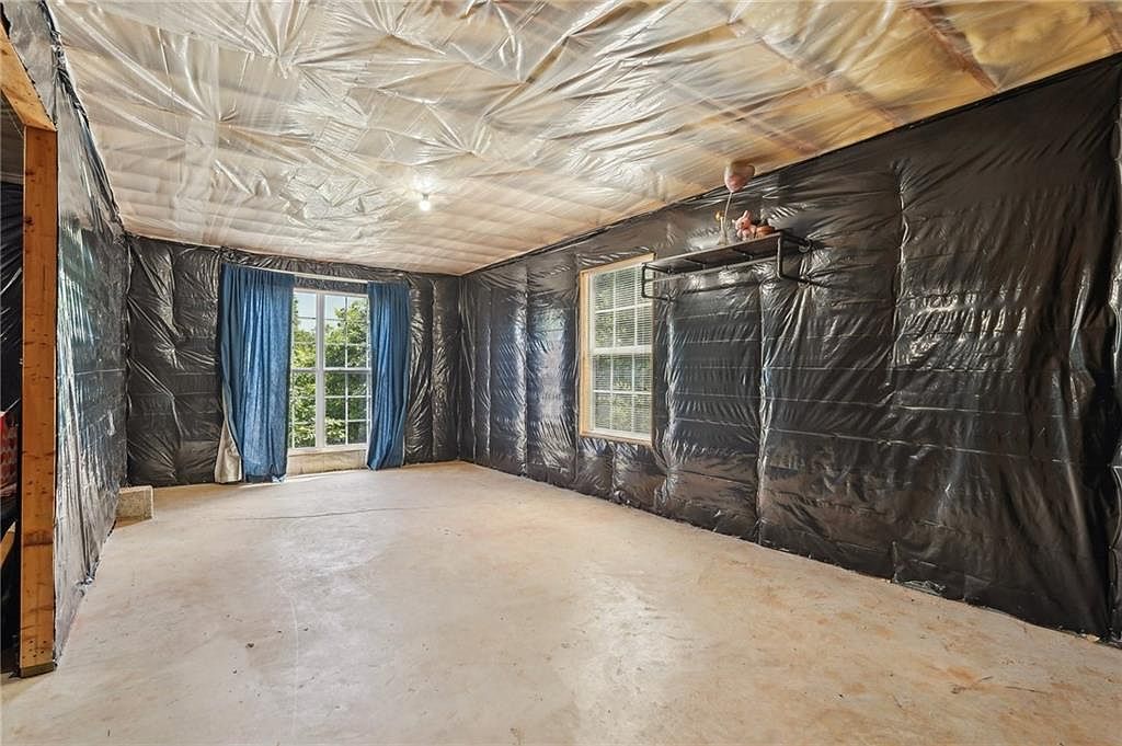 This spacious basement features exposed insulation covered in black plastic sheeting along the walls and ceiling, indicating that construction or finishing work is ongoing. The floor is a bare concrete slab, providing a blank canvas for future flooring options. Natural light filters in through two windows, one of which is adorned with blue curtains that soften the otherwise industrial atmosphere. A small wall shelf holds a decorative object, introducing a subtle personal touch. The open layout and large windows offer considerable potential for converting this area into a functional living or recreational space.