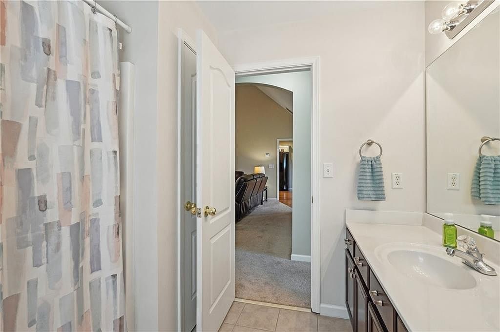 This bathroom features a clean, light-filled design with pale walls and a tiled floor that contrasts with the rich, dark wood vanity. A single sink with a modern chrome faucet sits beneath a large mirror that extends the length of the vanity, reflecting twice its openness. Soft blue-gray hand towels add a subtle pop of color. To the left, a shower is enclosed with a curtain boasting an abstract pattern in muted shades of grey and beige. The door to the bathroom is ajar, revealing a cozy carpeted living area beyond, hinting at the home’s inviting flow and warm atmosphere.