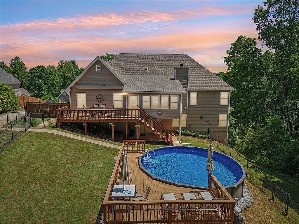 The spacious backyard features a well-maintained green lawn bordered by tall trees, creating a private and serene atmosphere. A large above-ground pool is inset into a wooden deck with comfortable lounge chairs and umbrellas, ideal for relaxing and entertaining. The home’s rear facade showcases light beige siding with multiple windows, allowing natural light to fill the interior. A raised wooden deck attached to the house offers an outdoor dining space with a table and chairs. The layout blends outdoor leisure and social zones, emphasizing a warm and welcoming aesthetic with natural wood tones and greenery.