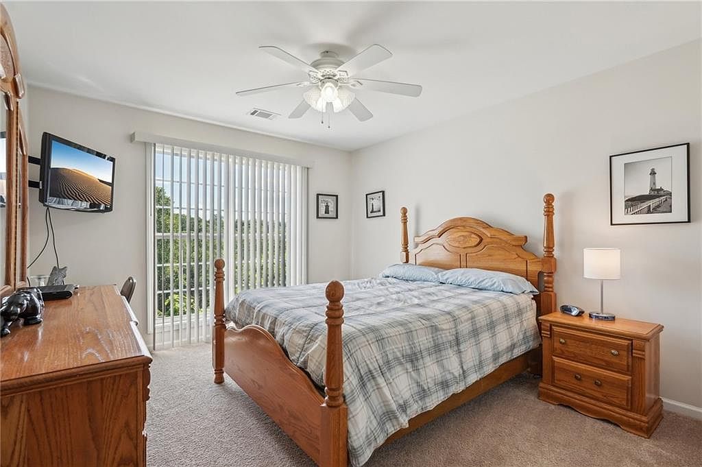 This serene bedroom offers a warm and inviting ambiance with its classic wooden furniture set, including a carved four-poster bed, matching nightstand, and dresser. The soft beige carpet complements the neutral wall tones, creating a calming backdrop. Natural light floods through vertical blinds covering a large window or sliding glass door, enhancing the room’s airy feel. Simple black-and-white framed artwork adds a subtle decorative touch. A ceiling fan with lights provides both comfort and illumination, while a wall-mounted TV offers entertainment without clutter. This space balances traditional charm with functional, understated decor for restful living.