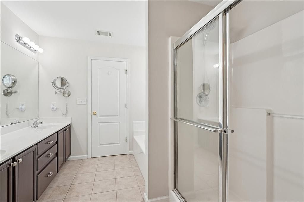 This bathroom features a clean, functional layout with neutral tones that create a calm atmosphere. On one side, a double-sink vanity with dark wood cabinetry contrasts elegantly with the white countertop and walls. Above the sinks, a large mirror spans the length of the vanity, enhanced by modern round vanity lights and a wall-mounted magnifying mirror. Opposite the vanity, a glass-enclosed shower with chrome trim and fixtures adds a sleek, contemporary touch. The floor is tiled in neutral beige, complementing the overall light, airy feel of the space. A white door leads to an adjacent room or closet.