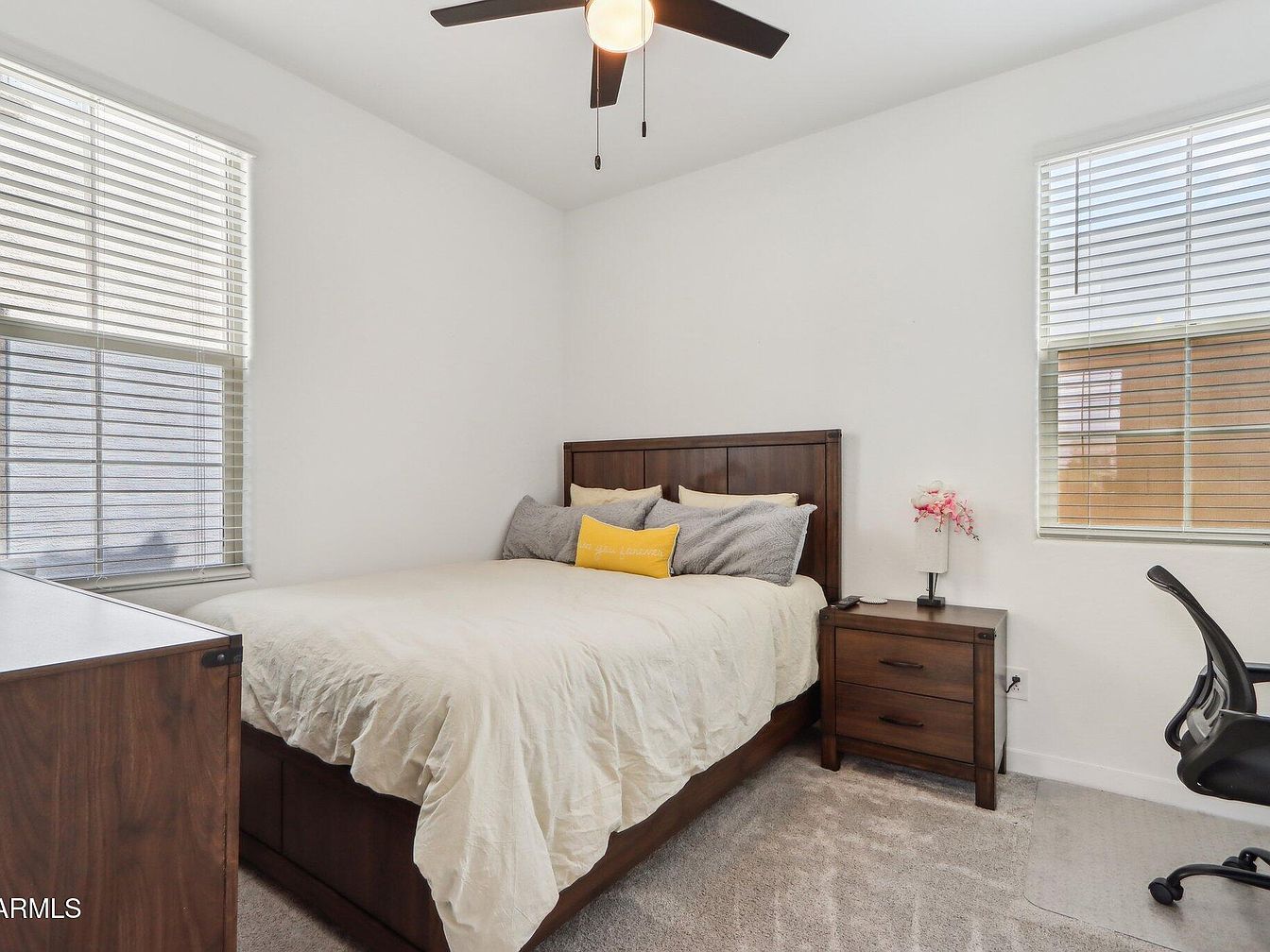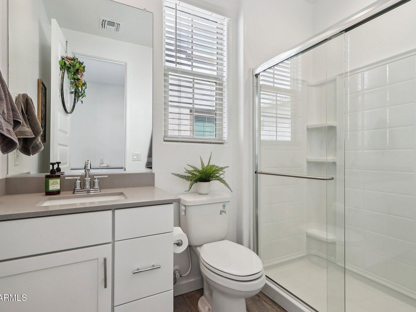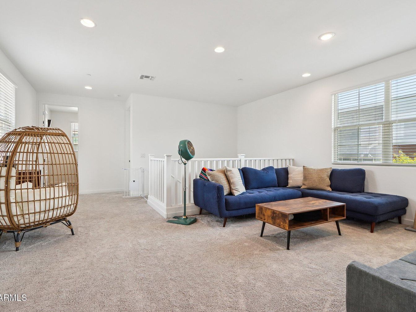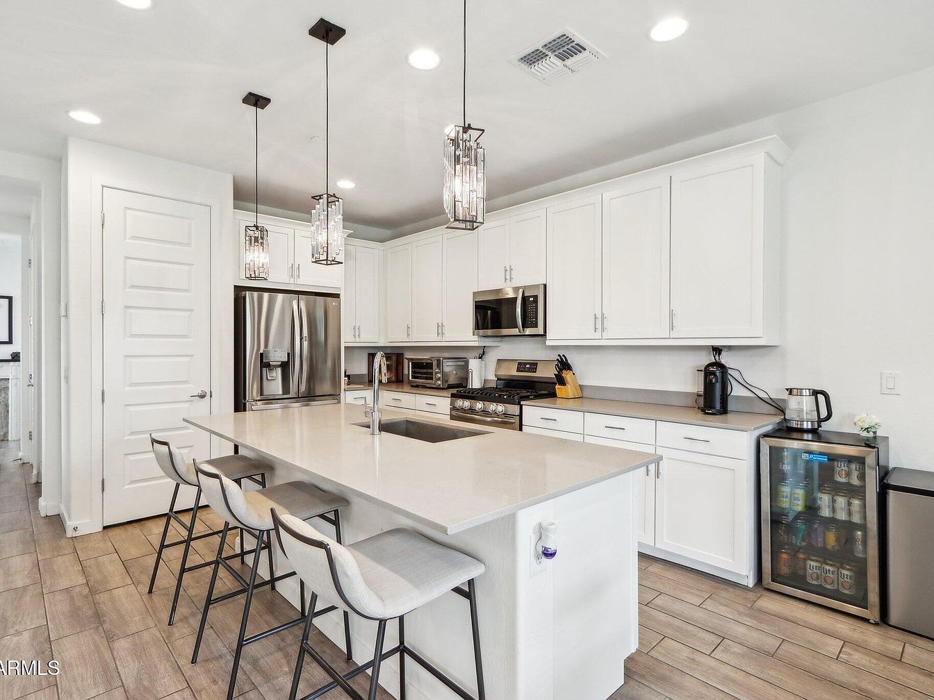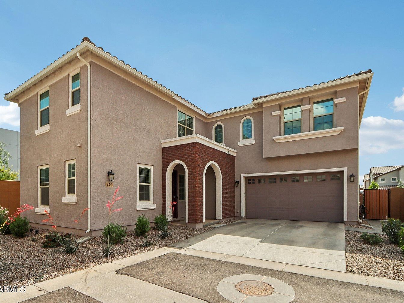 This exquisitely crafted residence exemplifies contemporary Southwestern architectural style, blending stucco exterior with subtle brick accenting around the arched entryway, topped with classic clay tile roofing. Located in the highly sought-after Warner Meadows community of Gilbert, Arizona, this home is just 2 years old, ensuring a fresh, modern living experience. Priced at $624,900, the property spans over 2600 square feet of thoughtfully designed living space including 4 bedrooms and 3 bathrooms. The community offers an array of amenities such as a heated pool, BBQ areas, playground, lush green spaces, and scenic walking paths, perfect for a balanced lifestyle of relaxation and recreation. The home features a low-maintenance front and backyard adorned with newly planted Ficus trees for privacy. Inside, a private downstairs guest suite with a full bathroom provides comfort for visitors or multigenerational living. The chef’s kitchen is showcased by a large island breakfast bar and stainless steel appliances including a gas range, seamlessly connecting to a bright family room that opens to a covered patio and turfed yard, ideal for pets and children. Additional highlights include a 2-car garage with an electric car charger, water softener, and an upstairs loft that offers flexible space for a game room, office, or additional living area. The master suite boasts a cozy sitting area, tinted windows, and a luxurious en-suite bathroom with dual vanities, a walk-in shower, and a spacious walk-in closet.