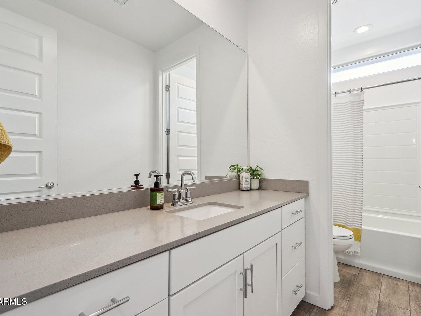 This bathroom features a modern and clean design with a spacious white vanity topped with a light beige quartz countertop. Sleek chrome fixtures complement the streamlined cabinetry that includes ample drawers and doors with modern silver handles. A large mirror extends the length of the vanity, enhancing the light and openness of the space. The room has bright white walls and ceiling, contributing to a fresh and airy ambiance. To the right, a glimpse of a white bathtub with glossy tile surrounds and a striped shower curtain adds subtle texture. The flooring is a warm wood-look tile, adding contrast and natural warmth to the otherwise minimalist and bright palette. Accents like a soap dispenser and small potted plants introduce subtle touches of personality and greenery.