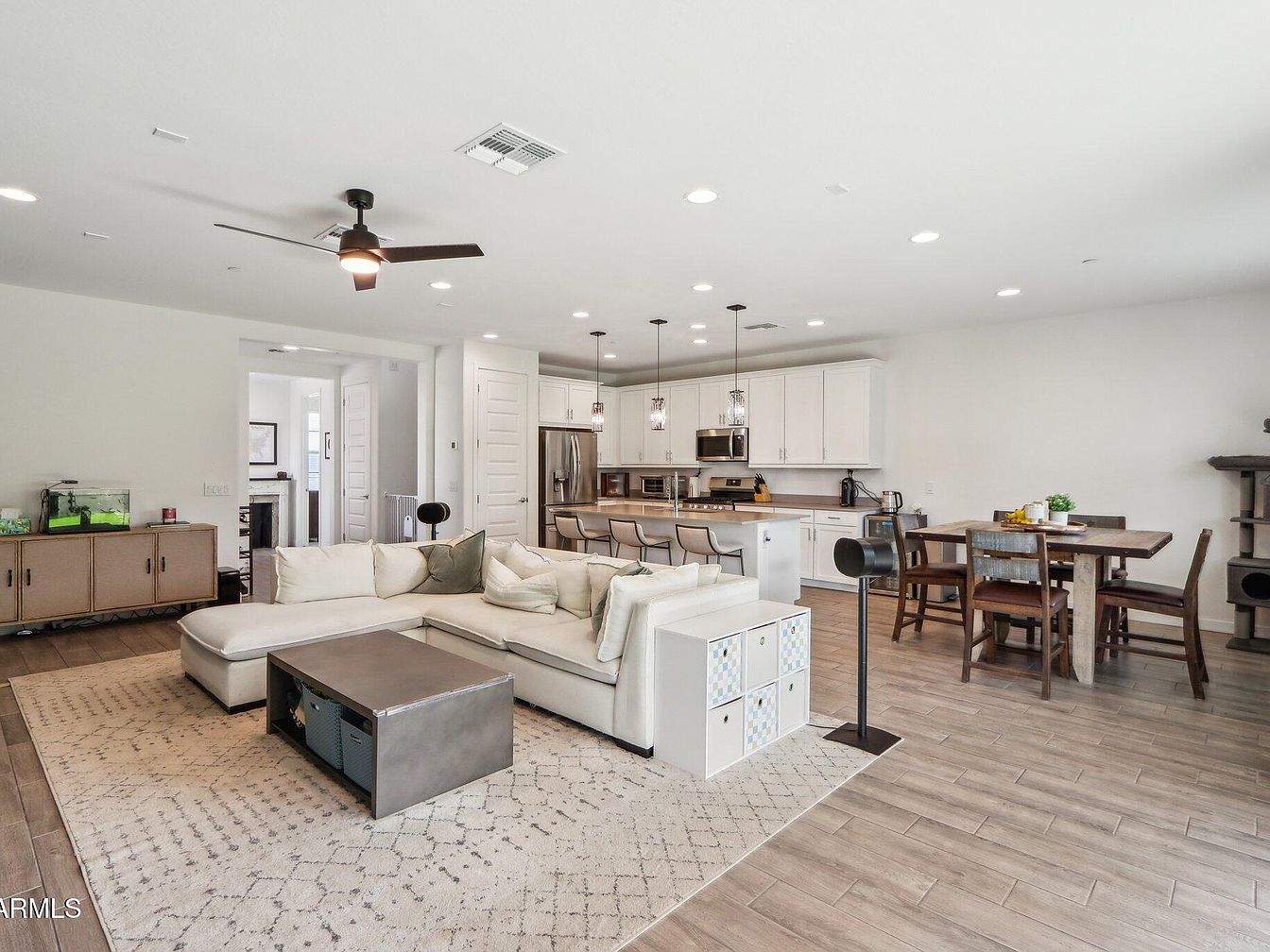 This spacious open-plan living area blends comfort and functionality with a clean, modern aesthetic. The soft beige sectional sofa anchors the seating zone atop a large, patterned area rug that complements the warm wood-like tile flooring. Adjacent is a sleek industrial-style coffee table with storage bins, balancing practicality with style. The white kitchen cabinets and island with four stools provide a bright, inviting contrast, illuminated by three pendant lights. The dining space features a sturdy wooden table and chairs, while a ceiling fan and recessed lighting contribute to the airy, well-lit ambiance.