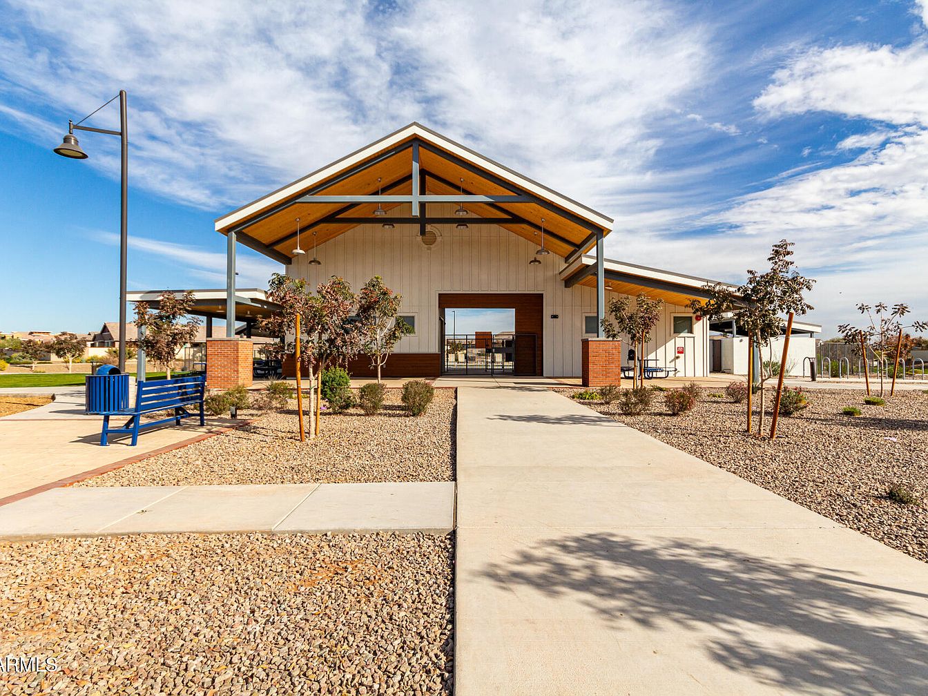 This outdoor community space features a modern pavilion with a peaked roof supported by steel beams and brick columns, combining industrial and rustic elements. The exterior walls display vertical white siding with warm wood accents beneath the overhang. A wide concrete pathway leads to the pavilion entrance, flanked by xeriscaped landscaping with small, neatly spaced trees and drought-tolerant shrubs. Bluish benches and black lampposts add functional seating and lighting. The area is open and airy, making it ideal for gatherings or relaxation within a well-maintained neighborhood park setting.